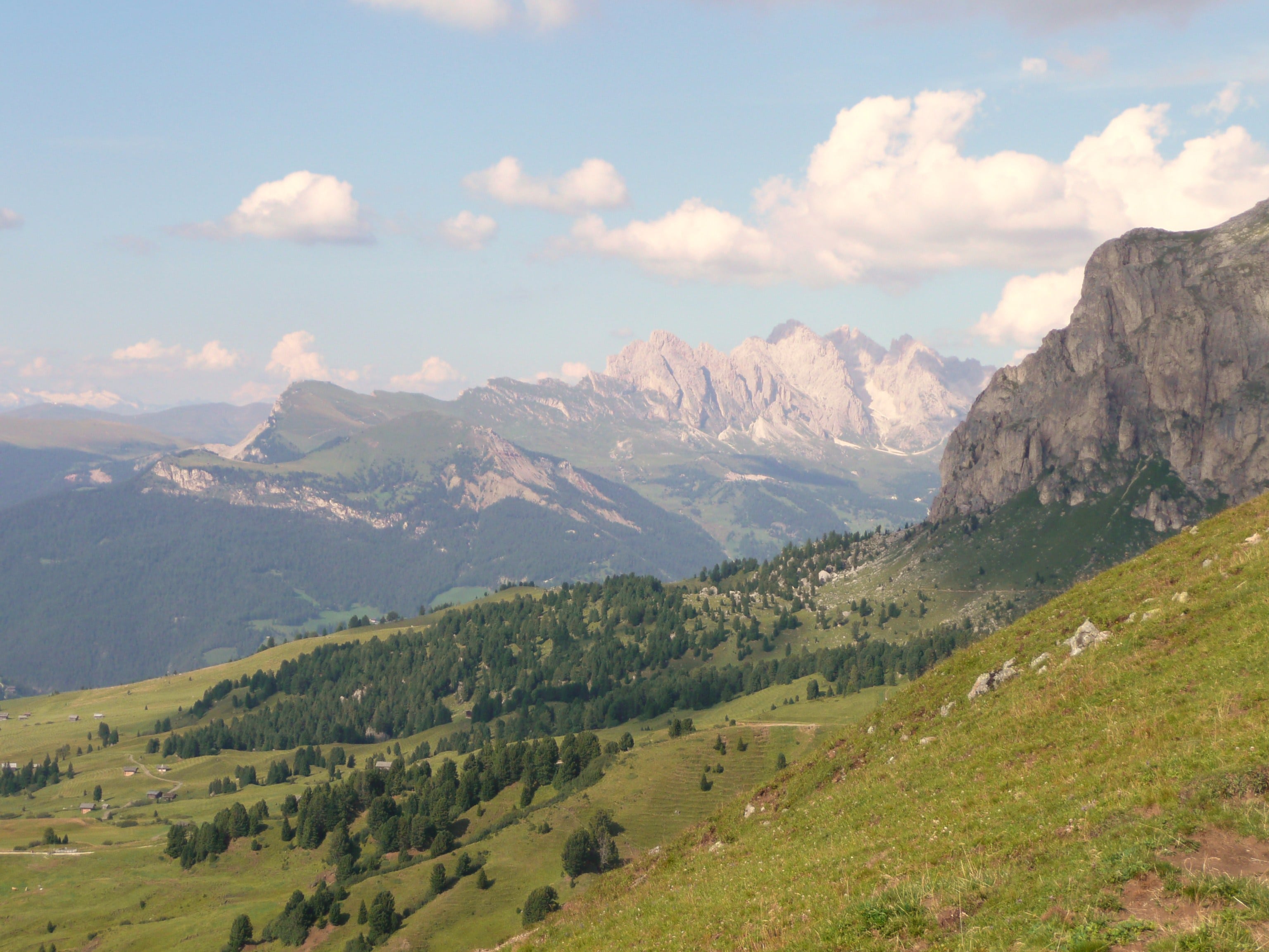 Mit dem Spitzbühel beginnt der Panorama- und Hüttenmarathon oben auf der Seiser Alm. Auf dem Weg über Laurinhütte, Alpenhotel Panorama, Almrosenhütte, Mahlknechtjochhütte und Dialer Kirchlein kann man sich gar nicht sattsehen an den bekannten Dolomitengipfeln: Langkofel, Plattkofel, Marmolada, Sellagruppe, Sas Rigais, Geislerspitzen, Rosszähne, Schlern mit Santnerspitze. Bei gutem Wetter reicht der Blick noch viel weiter, z. B. bis in die Zillertaler und Stubaier Alpen und bis zum Ortler!