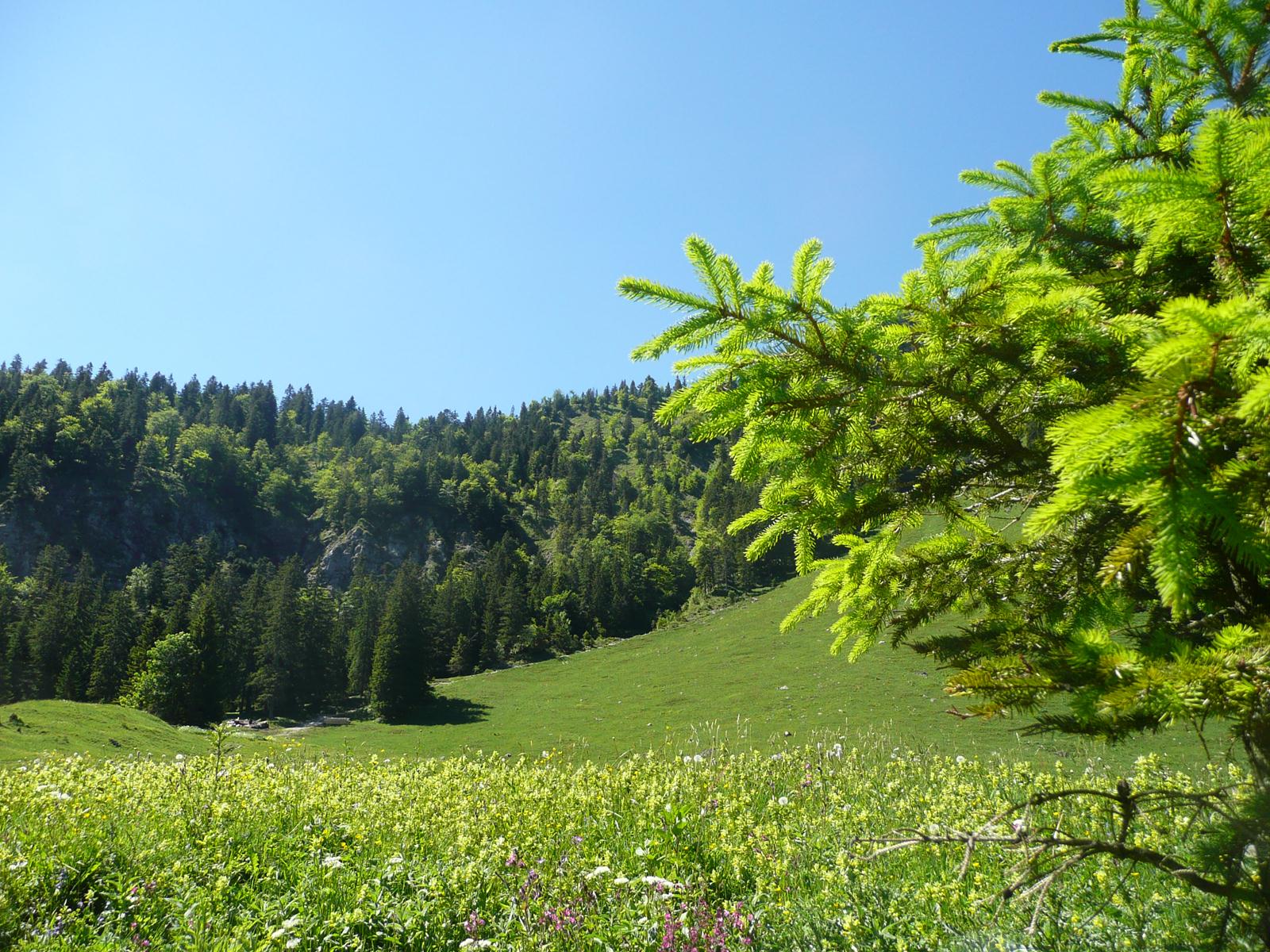 Ab dem Gipfelkreuz auf dem Sattel bietet sich an, den Weg Richtung Benediktenwand zu nehmen und kurz danach nach rechts abzubiegen zur Pessenbacher Alm, die bereits von oben zu sehen ist. Von dieser Alm führt ein Weg zur Forststraße weiter, auf der man bei Abfahrt von der Staffelalm vorbeikommt.