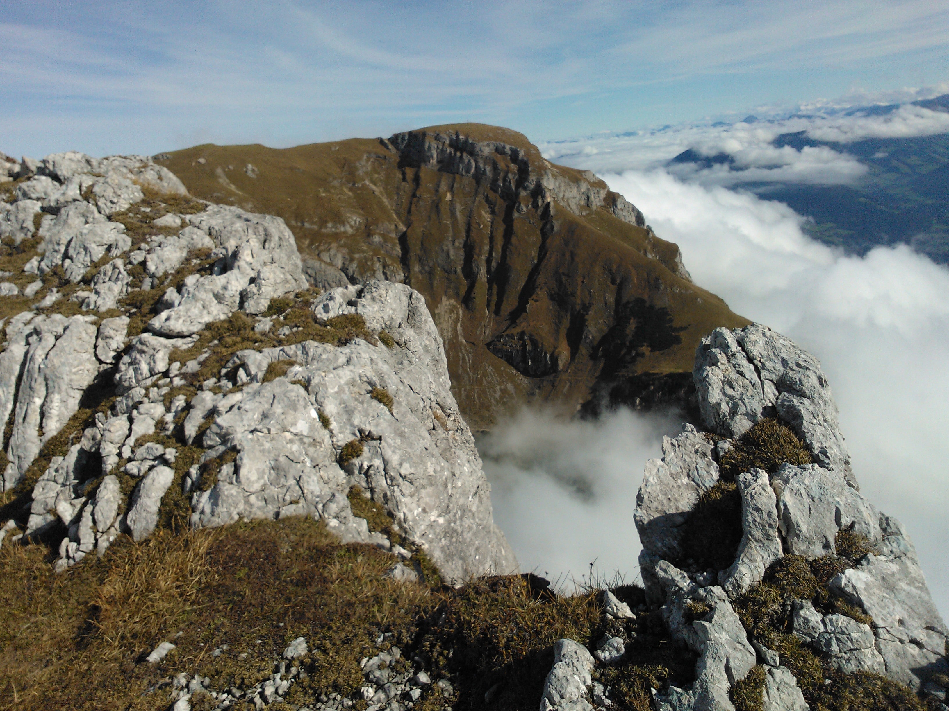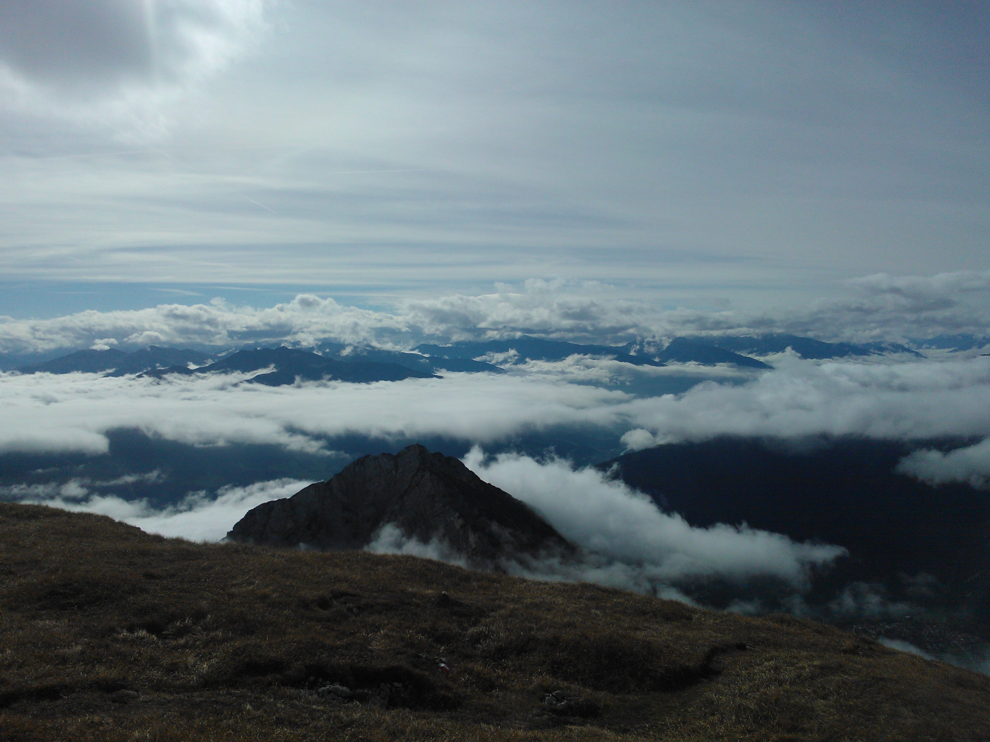 Nach der Durchquerung oder dem Aufstieg sind es noch gut 10 Minuten bis zum Gipfelkreuz, dessen Plateau man nun überschreitet und nun bis zum Ende des Grates weiterläuft. Dort ist der Einstieg zur nächsten Passage, die nach unten führt. Dieser Klettersteig (B/C) bietet immer wieder tolle Ausblicke auf das Rofangebirge und das Inntal. Wer hier technische- oder Höhen-Probleme hat, sollte die nächste Passage lieber auslassen. Man querst nach dem Erreichen des Wanderweges ein Stück gen Nord/West und Richtung Schafsteigsattel/Rofanspitze und erreicht bald die brüchige Südflanke des Rosskopf (2.246 Meter). Schon am Einstieg herrscht starke Steinschlaggefahr! Dieser Klettersteig ist mit Sicherheit nichts für Anfänger, schon der erste Anstieg geht stellenweise fast senkrecht nach oben (Schwierigkeit C/D). Nachdem man eine etwas leichtere Stelle überwunden hat, wird der nun deutlich leichter. Man verlässt eine Rinne und danach auf einem Grasrücken nach rechts die steile Südwand. Das war mit Abstand die schwierigste Passage, die es zu klettern gilt. Im Vergleich dazu ist der Abstieg vom Rosskopf auf die andere Seite ist ein Klettersteig der Kategorie B, also deutlich leichter und viel kürzer. Man erreicht ihn über eine steil abfallende Wiese zwischen Rosskopf und Seekarspitze.