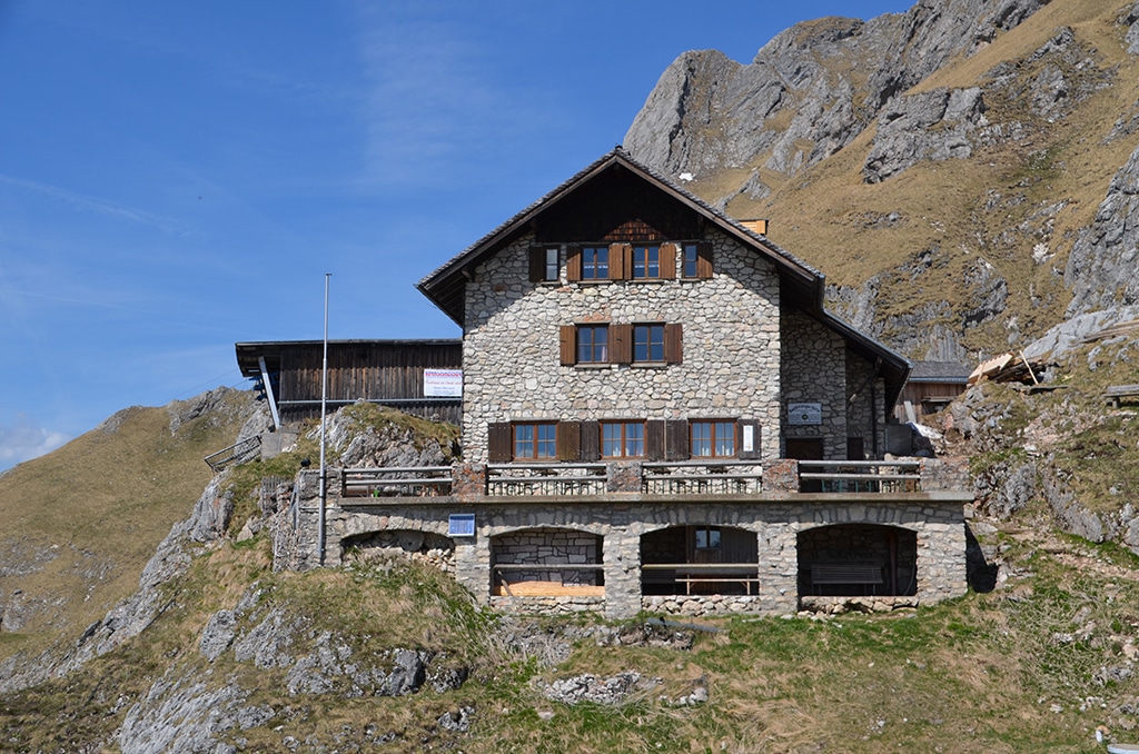 Nach gut eineinhalb Stunden erreichen man die Einsattelung zwischen Aggenstein und dem östlich gelegenen Brentenjoch. Die Staatsgrenze zu Bayern legt den Blick ins Allgäu und dem im Tal gelegenen Forggensee frei. An der Scharte hält man sich nach links und erreicht knapp zehn Minuten später die Bad Kissinger Hütte Aggenstein.