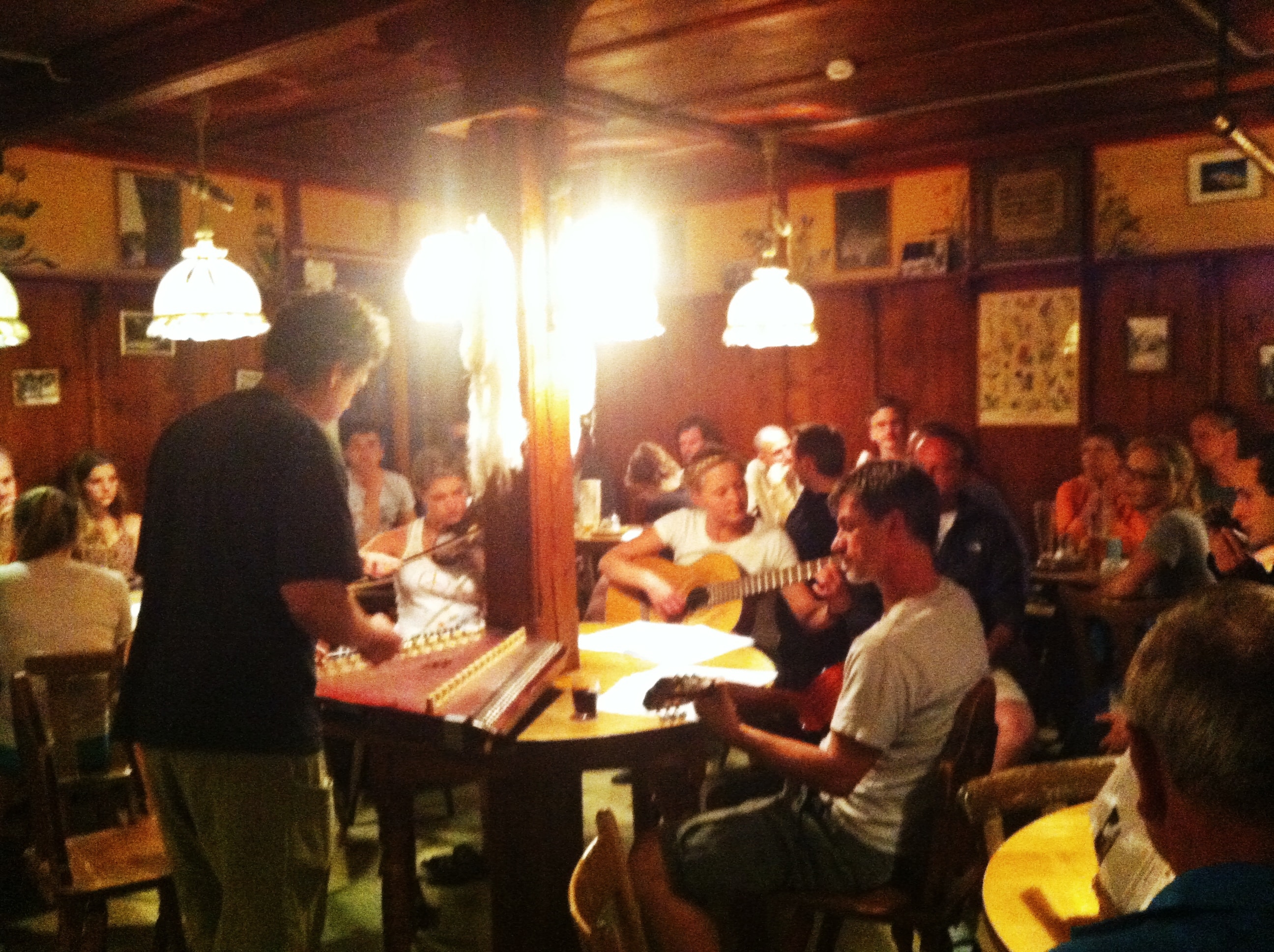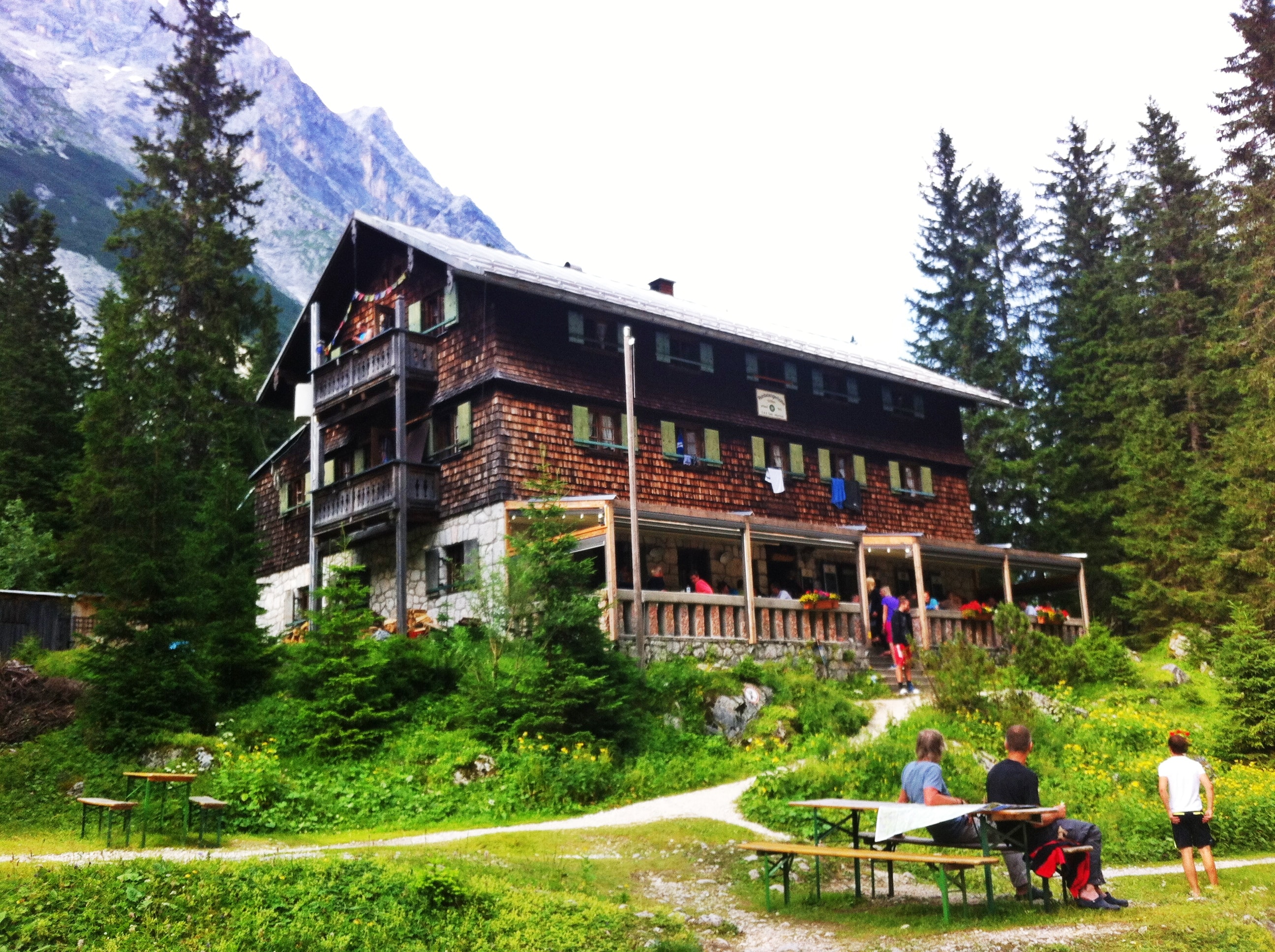 Seit Jahren steht sie auf der Wunschliste: Die Zugspitzbesteigung. Viele der Gipfeln rund um Deutschlands “Höchsten” haben wir in den letzten Jahren bestiegen und beschrieben, aber eben nicht diesen. Im Juli 2013 ist es nun so weit. Kurzentschlossen machen wir uns auf den Weg nach Garmisch-Partenkirchen und stellen das Auto am Ski-Olympiastation, am Eingang in die Partnachklamm ab. Die ersten 45 Minuten bis zum Eingang in die Klamm sind eher Volkswandertag als Bergtour – Busse und mit Bussen gefüllte Wandergruppen begeben sich auf den Weg in die Klamm. Wer die Klamm nicht kennt, dem sei sie hiermit (auch wenn es nur für einen Tagesausflug ist) ans Herz gelegt. Beindruckende Bilder, und, bei der Hitze im Juli, eine angenehme Kühle werden hier geboten. Ab dem Ausgang aus der Klamm beginnt leider ein etwas “langweiliger”, seichter, Aufstieg durch das Reintal auf deinem breitem Forstweg. Die gut zweieinhalb Stunden bis zur Bockhütte sind aber leider unumgehbarer Bestandteil der 2-Tages-Tour. Die Bockhütte ist dagegen willkommener Stilwechsel der Landschaft und Abkühlstation bei 30 Grad im Schatten. Ab hier startet ein schmaler, schön zu gehender Pfad, der sich zweieinhalb Stunden entlang der Partnach hinauf zu Reintalangerhütte schlängelt. Immer wieder kühlen wir uns ein bisschen in den Gumpen der Partnach ab, die am Wegesrand zu finden sind. Wer gerne in Hütten auf Bergen übernachtet, der wird sich in der Reintalangerhütte gleich wohl fühlen. Ein urige Stube (Restaurant genannt), eine Panoramaterasse für das Abendessen und Frühstück, direkt am Flüsschen, Stuhl- und Liegebereich, um den Nachmittag und Abend dort ausklingen zu lassen. Weitere Besonderheiten der traditionsreichen Hütte sind die abendliche Hausmusik, bei der alle Mitarbeiter mitmachen “dürfen”. Chef des Orchesters ist Hüttenwirt Simon Neumann, der auch morgens um 6 Uhr mit seinem noch zu definierendem Instrument Natur, die nahe Fuchsfamilie und die rund 120 Gäste weckt.