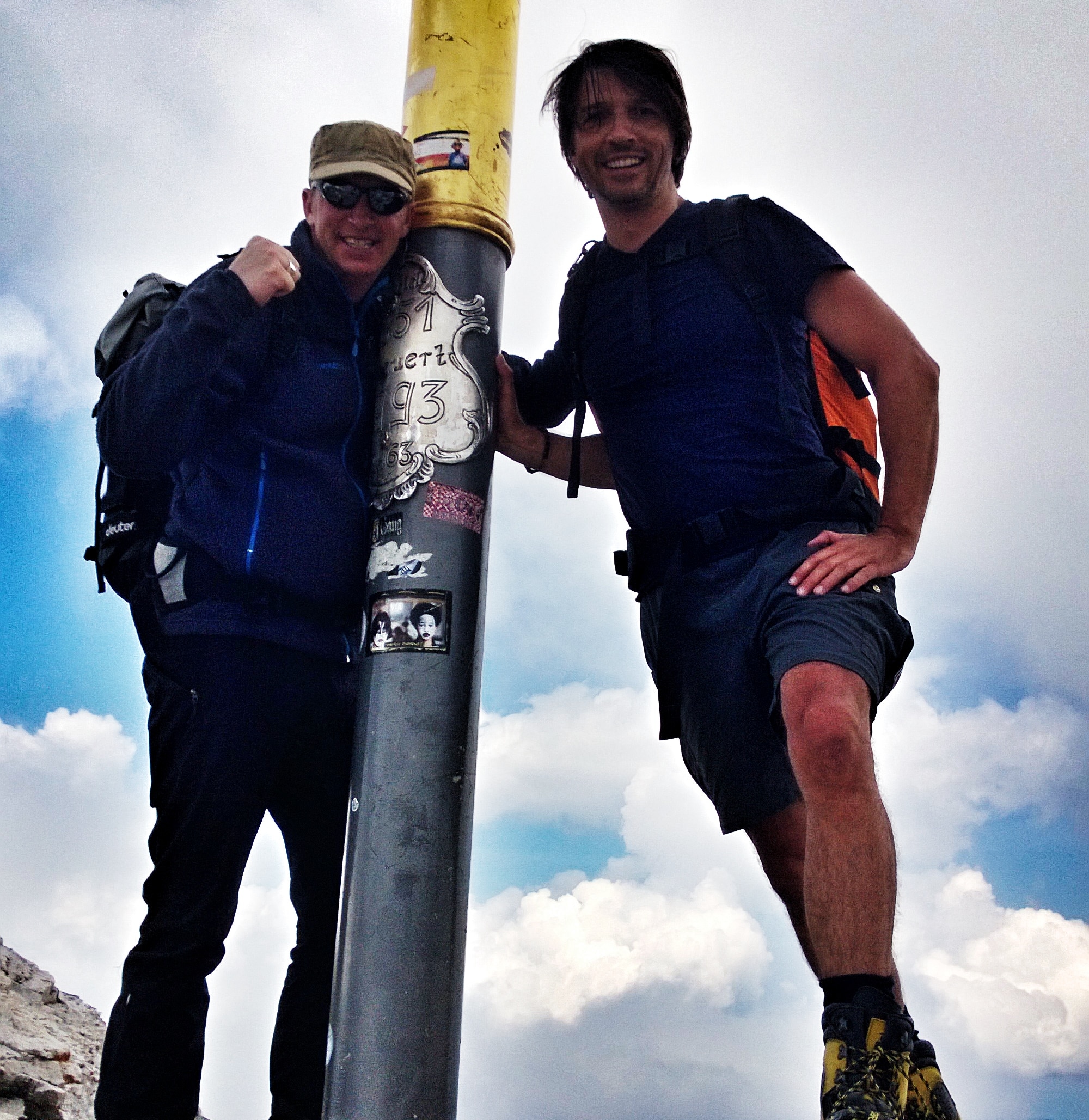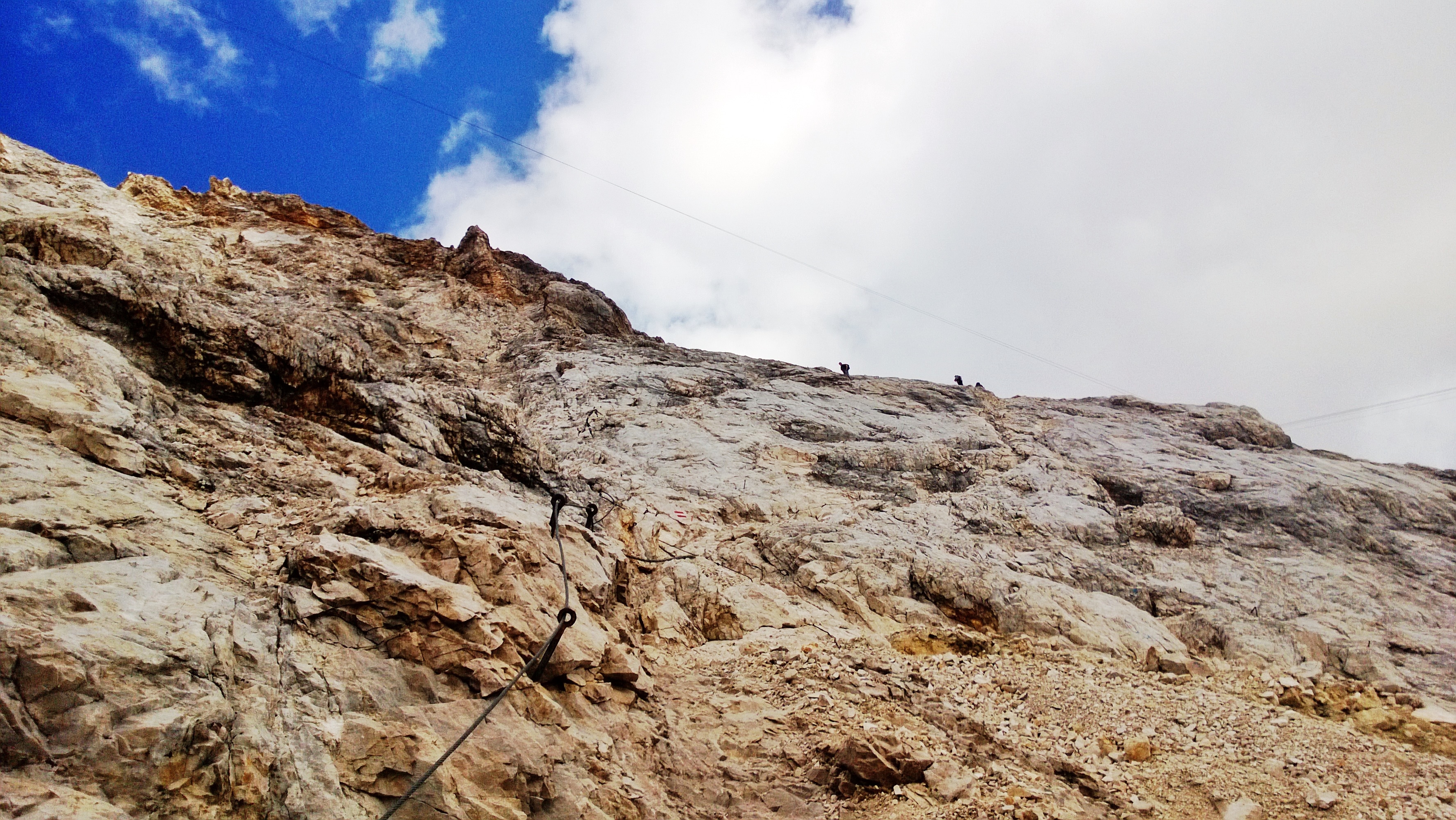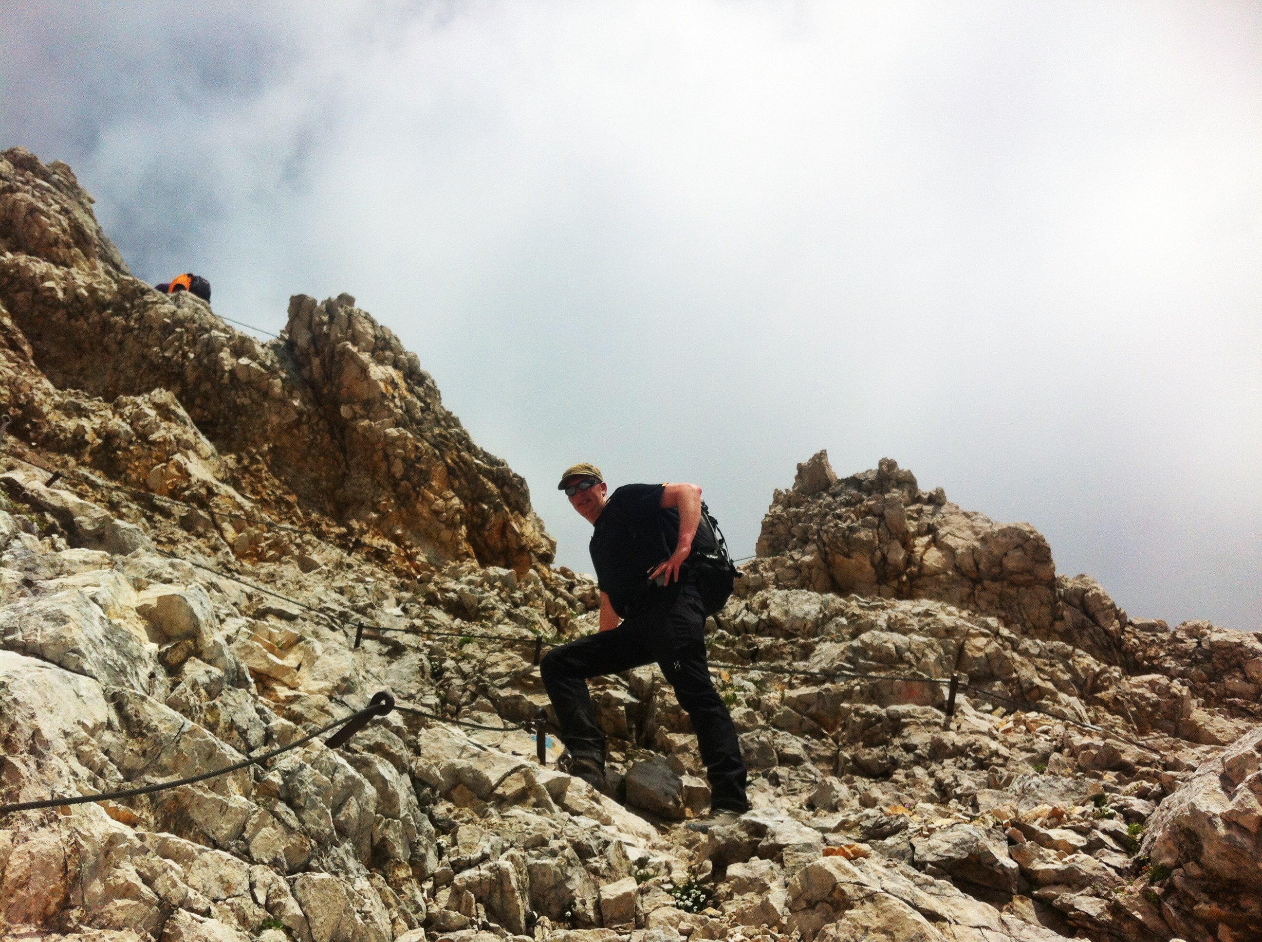 Endlich erreichen wir den versicherten Steig und der Stein wird fester, so das wir uns mit Stahlseil und festen Tritt auf die letzte Etappe, den nun circa 60 minütigem Anstieg zum Gipfelkreuz, aufmachen. Auch hier ist man nie alleine. Gondeln mit Touristen schweben neben uns hinauf und herab, eine Perlenkette an Bergsteigern reiht sich im Steig bis zum Gipfel vor uns auf bevor wir schließlich den Einstieg zur Treppe zum Münchener Haus erreichen. Wer hier “innerlich” unvorbereitet und mit Rucksack und abgekämpft die “Bühne” Zugspitze betritt, könnte leicht die Flucht nach unten antreten. Touristenmassen, Bratwurstduft und Bierbänke dominieren den Gipfelblick. Wir lassen uns vom Gewimmel nicht stören und stürmen über die Eintrittstür zum Jubiläumssteig das Gipfelkreuz. Anstellen zum Fototermin und 5 Minuten später reihen wir uns schon die die Touristenschar samt Bratwurst und Gipfelbier ein.