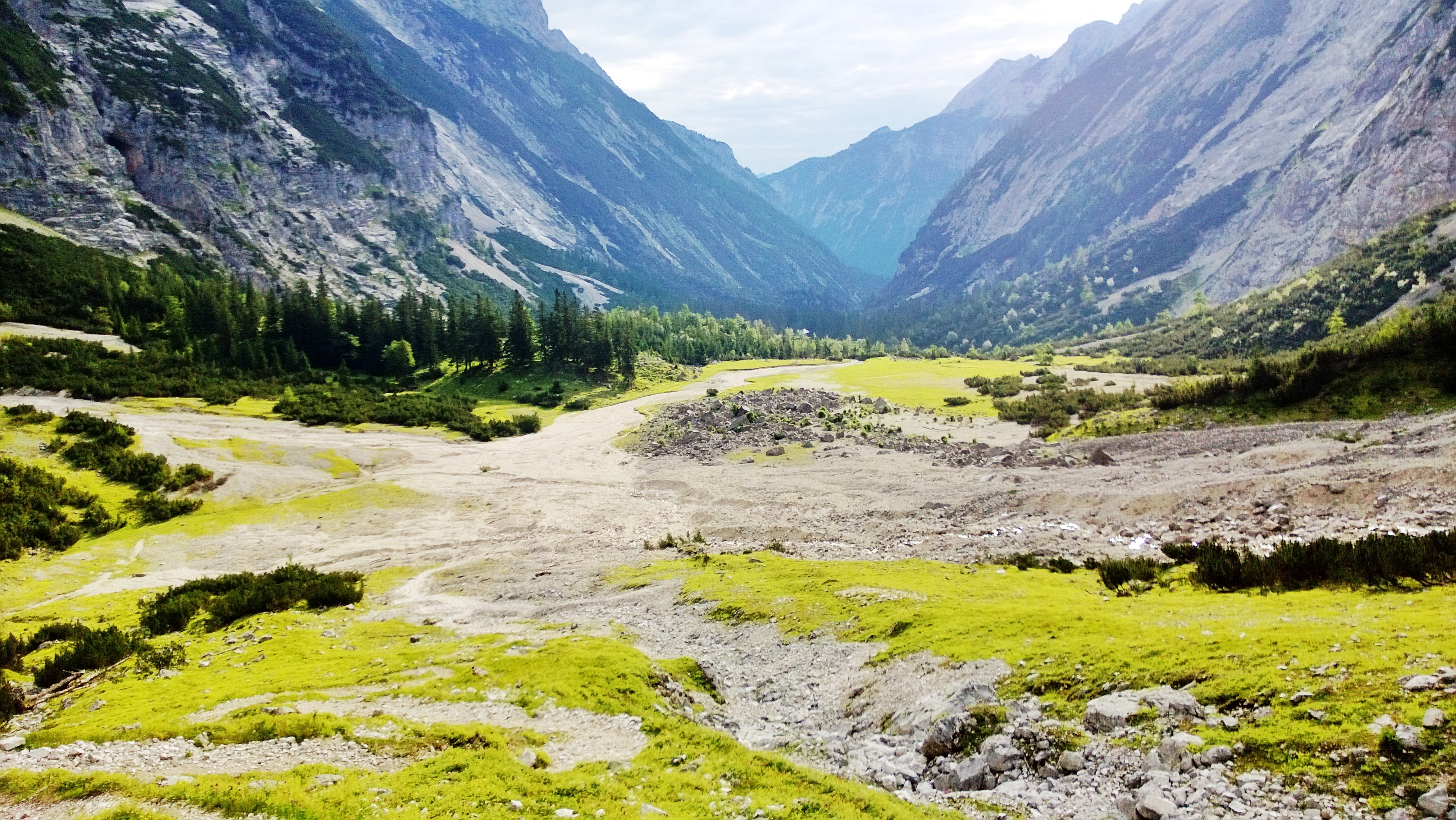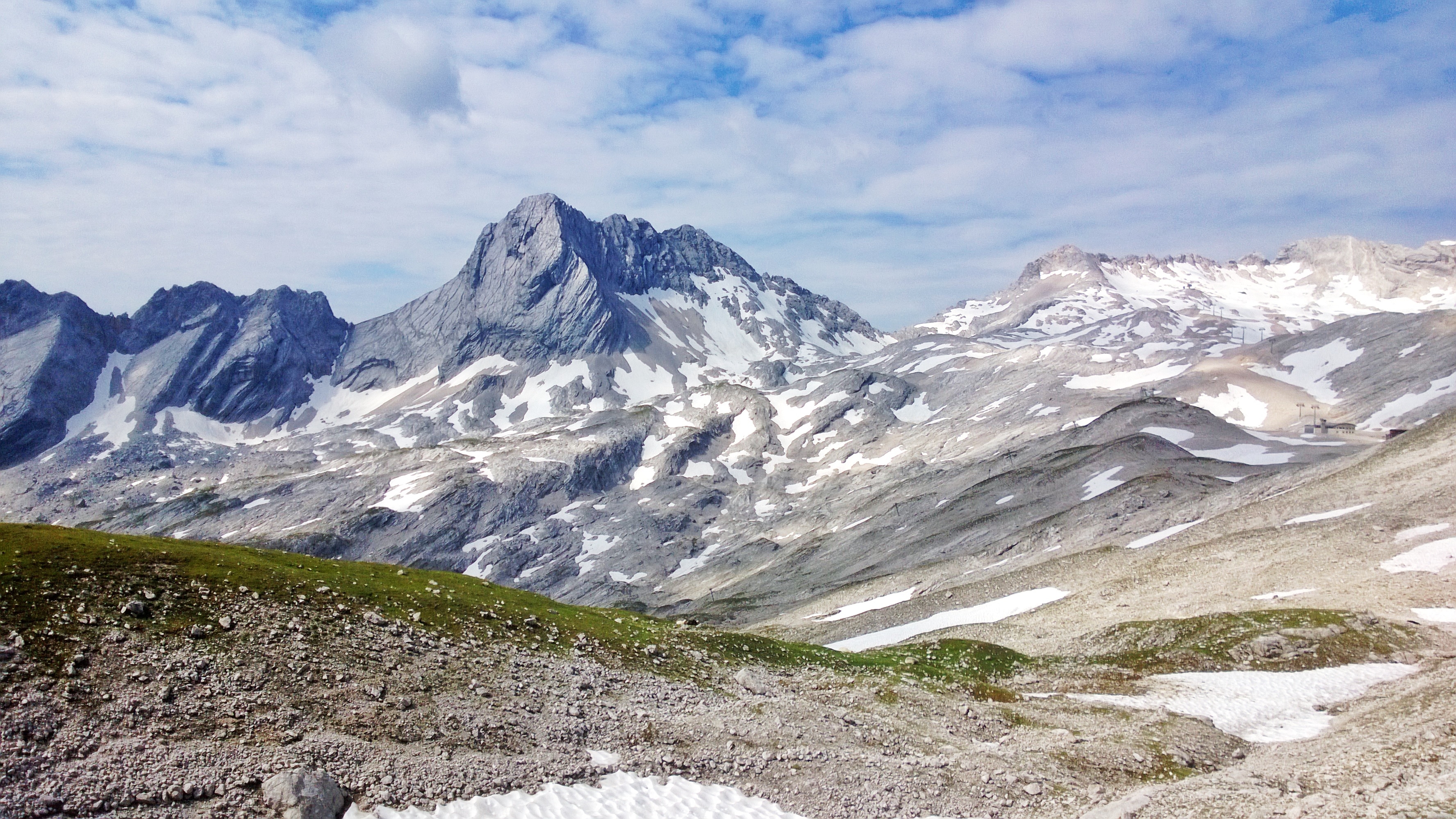 Der eigentliche Teil der Bergtour beginnt nun. Einige Frühaufsteher haben sich bereits im Morgengrauen auf den Weg gemacht. Wir lassen es langsam angehen, frühstücken in Ruhe und machen uns gegen 8 Uhr auf den Weg zur Knorrhütte. Nach dem 15 minütigem, flachen Ende des Talkessels, beginnt der rund 1.600 Meter lange Anstieg zum Gipfel. Der Gebirgspfad schlängelt sich, manchmal steinig, manchmal von Geröll bestimmt, in Richtung der letzten Schutzhütte vor der Zugspitze. Wir rasten kurz, füllen die Trinkvorräte auf und machen uns zügig auf den Weiterweg, der nun schnell in das Zugspitzplatt führt. Schafe und Schneefelder bestimmen nun den Weg – da der Anstieg im oberen Teil an Steilheit verliert, sind die Schneefelder im Juli keine Abrutschgefahr.