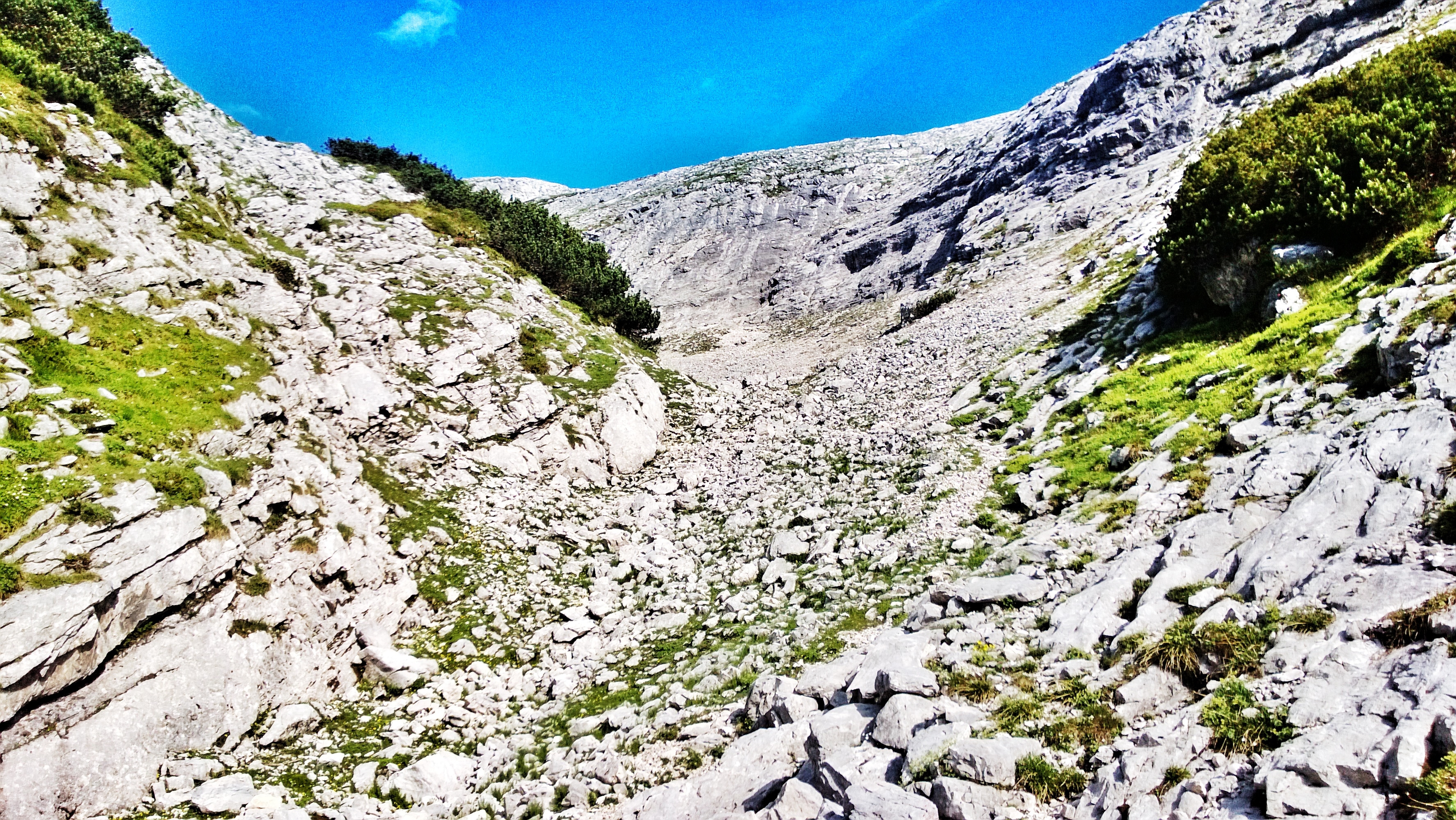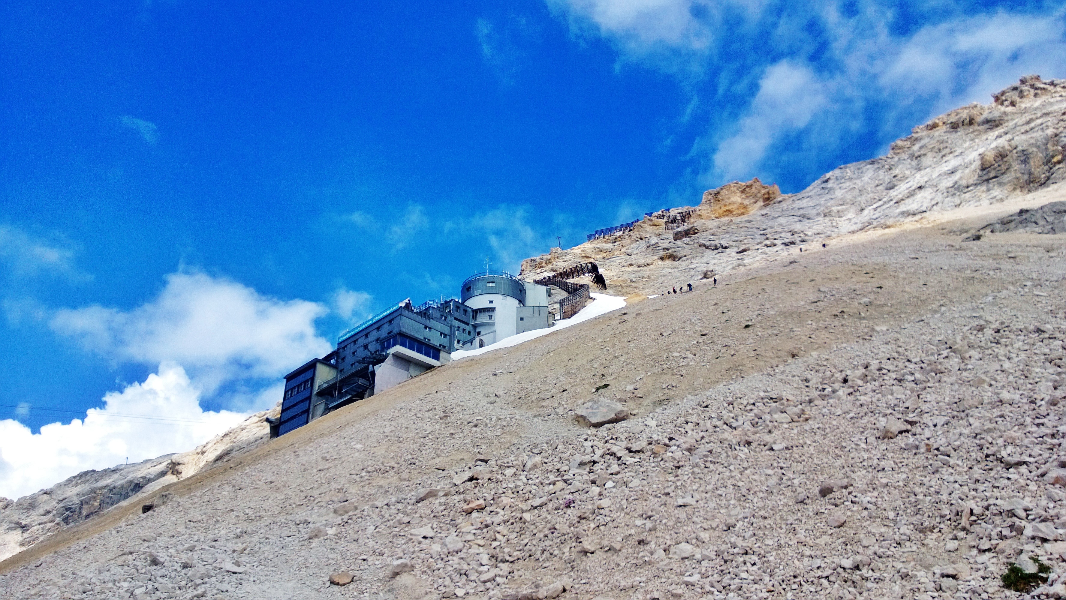 Das ändert sich mit dem Geröllberg, der knapp oberhalb des Bahnhofs am Zugspitzplatt beginnt. Das Skigebiet, der deutlich zurückgegangene Gletscher, die fast schon “verbaute” Landschaft, machen den Aufstieg irgendwie für eine Bergtour etwas surreal. Wer Bergidylle erwartet, sollte andere Gipfel aufsuchen. Die “Mondlandschaft” bis zum Einstieg in den Steig gehen wir mit einigen Flüchen in gut 45 minuten empor. Immer wieder rutscht man auf den Geröllfeldern Richtung Bahnhof runter, Tritte lassen sich nicht gezielt setzen. Irgendwie kämpft man sich wie durch einen schräg stehenden Sandkasten gen goldenem Gipfelkreuz hinauf.