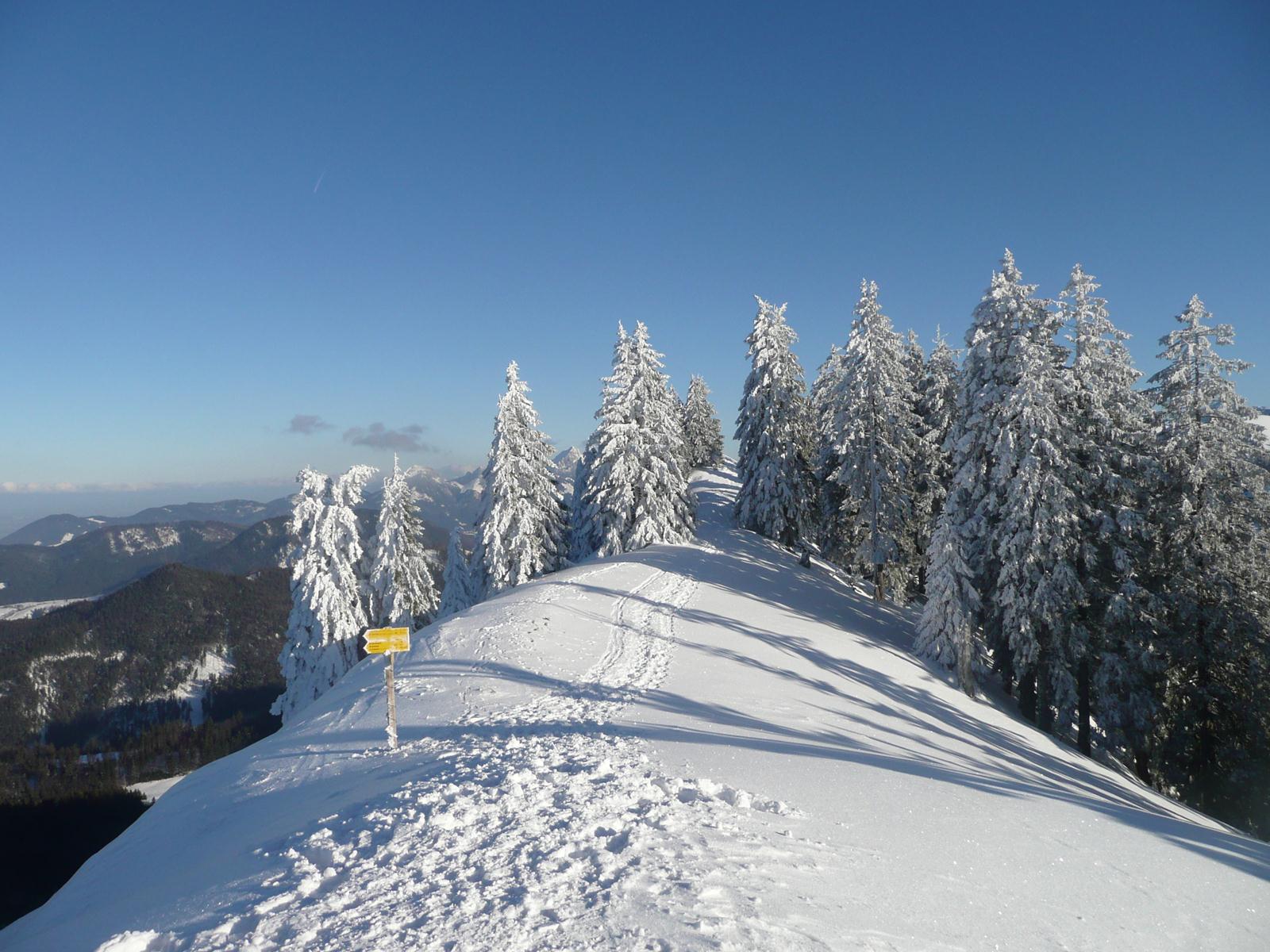 Nach kurzer Rast mit wunderschönem Ausblick über das gesamte Tegernseertal geht es zurück zum Bergrücken und diesem folgend in Richtung Baumgartenschneid Tegernsee. Zuerst leicht steigend, nach gut zehn Minuten intensiverer Steigung läuft man zumeist links des Kammverlaufs circa 45 Minuten auf den Baumgartenschneid. Von hier kann man den Ausblick hinüber zur Gindelalmschneid und ins Tegernseer Tal genießen. Über den schneebedeckten Gipfelhang steigt man letztendlich hinauf zum tief eingeschneiten Gipfelkreuz. Bei hoher Schneelage oder Vereisung empfiehlt es sich für den Abstieg von der Baumgartenschneid den Aufstiegsweg über den Riederstein und das Riedersteinhaus zu wählen. Die Rodelbahn erweist sich als der gefährlichste Teil des Abstiegs, da die glatt gefahrenen Passagen nicht einfach zu laufen sind. Bei Sonne und tief verschneitem Wäldern ein traumhafter 2-3 Stunden Aufstieg mit herrlichem Blick über die gesamten Voralpen und die Bayerischen Alpen!