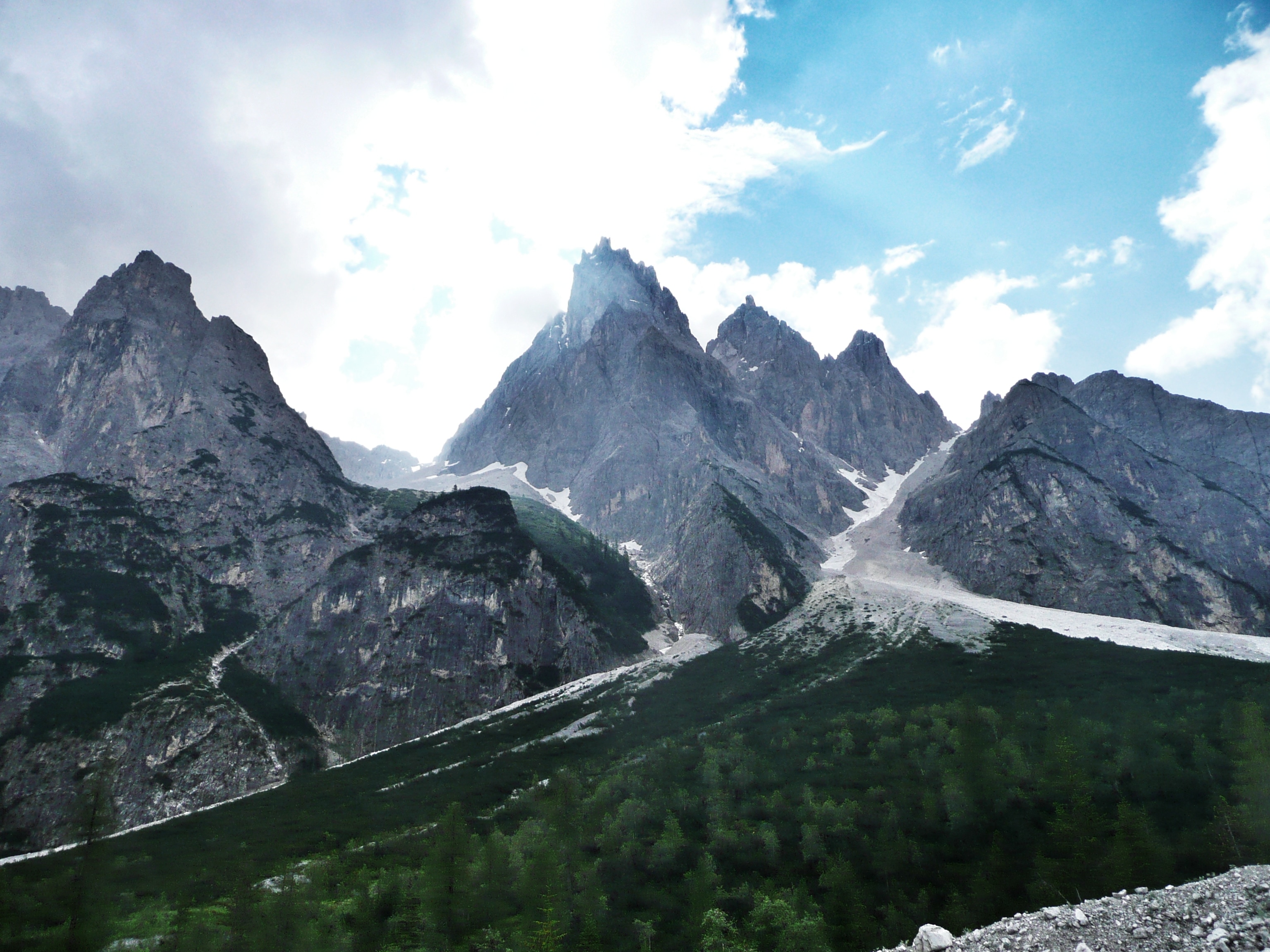 Traumwetter in den Sextener Dolomiten. Bislang. Der heutige Tag ist etwas bewölkt, was nach zwei Tagen mit über 30 Grad als Erholung gewertet wird. Etwas schade, das eines der Highlights in den Sextener Dolomiten deswegen wahrscheinlich etwas in den Wolken liegen wird. Aber alleine der Gedanke an den Ausblick auf die drei berühmten Zacken treibt uns an – die Aussicht auf etwas kühleres Wetter ebenso. Die Bergwanderung zur Hütte ist mit gut 1.000 Höhenmetern und 5-6 Stunden angesetzt – je nachdem, wie lange man auf der Drei Zinnen Hütte rasten möchte oder ob man noch die ein oder andere Hütte unterhalb der Kalkzacken anwandern möchte.