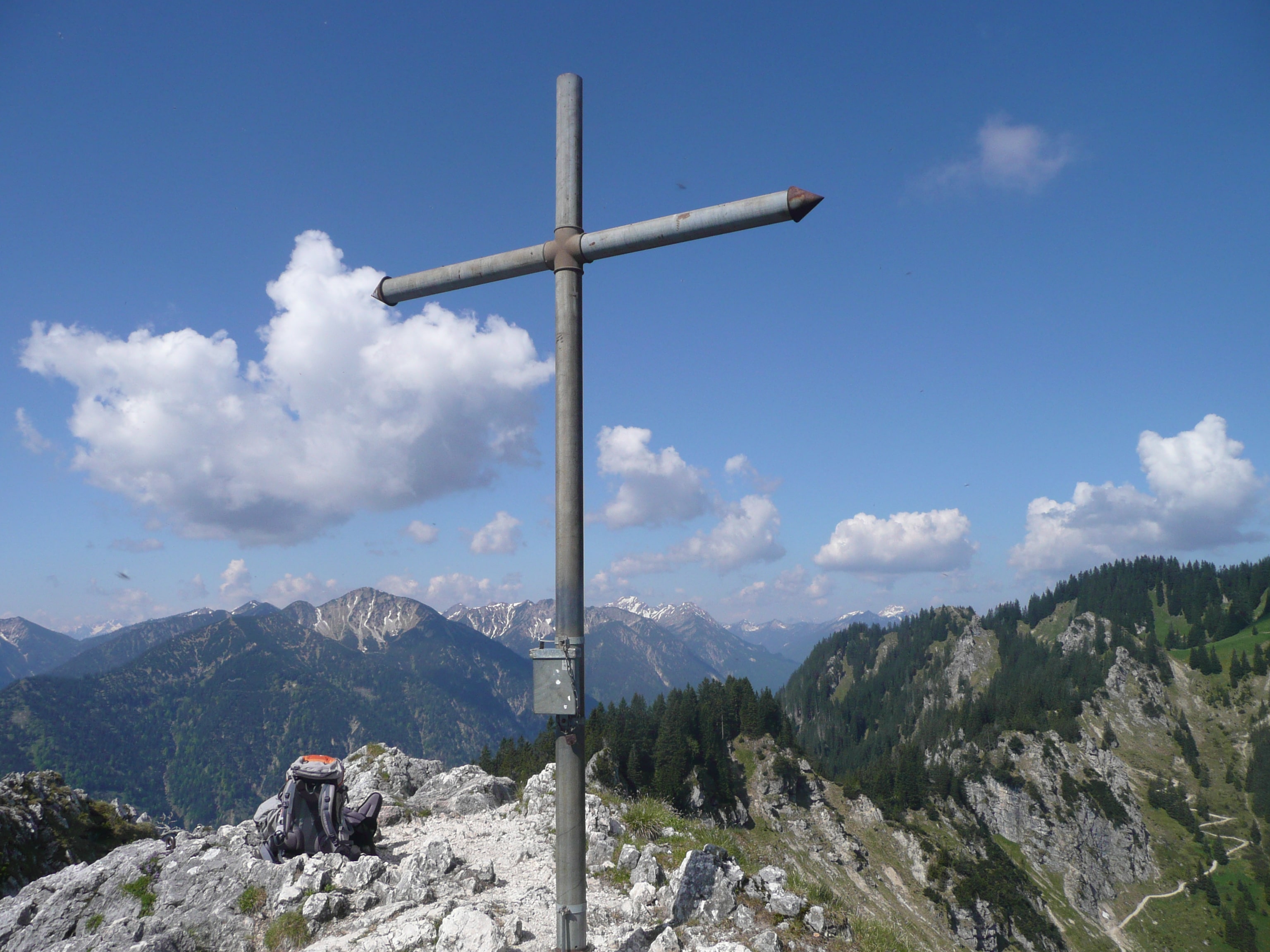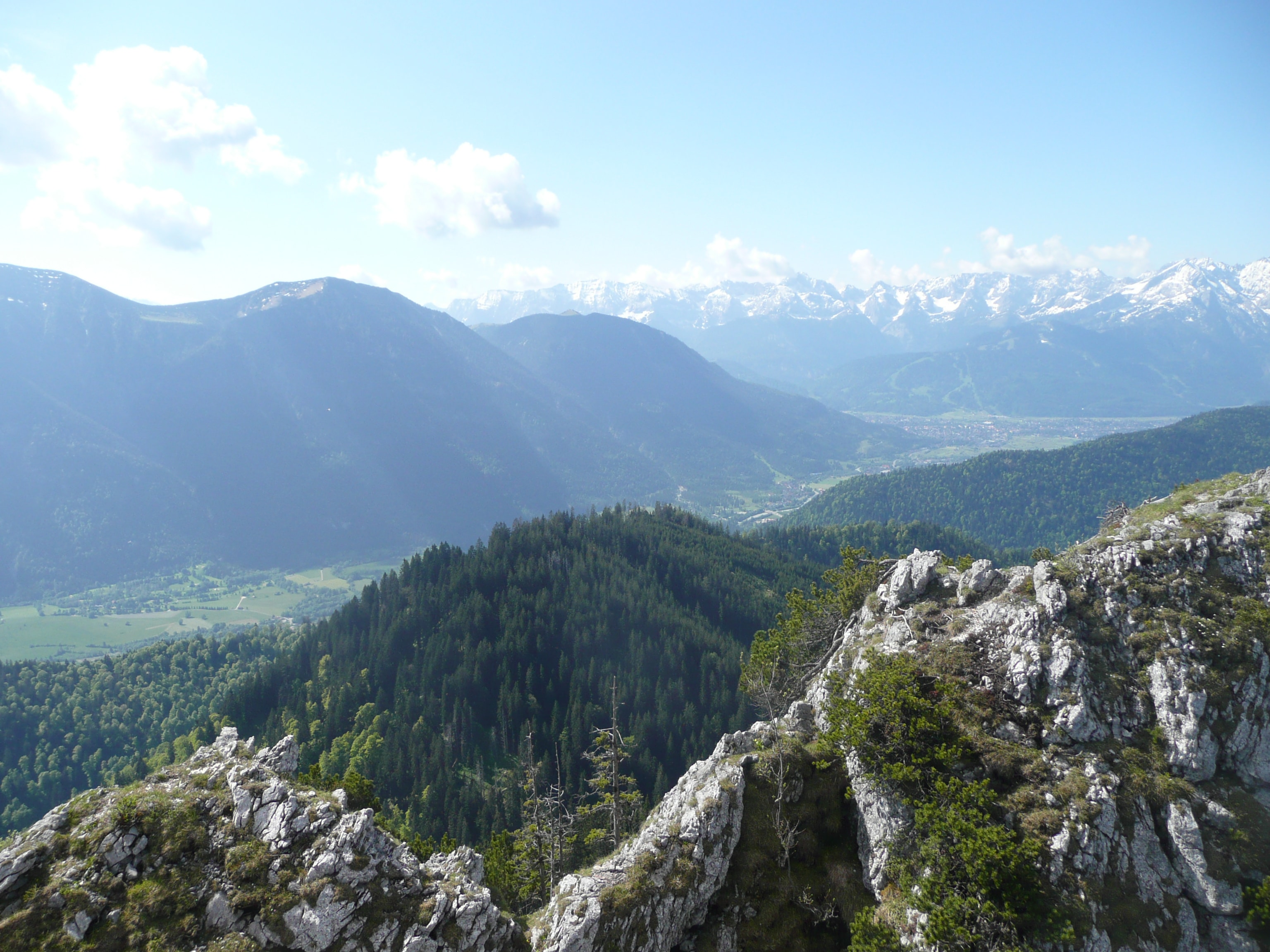 Den Einstieg zum Klettersteig erreicht man nach gut weiteren 10 Minuten. Die Kette, die den Aufstieg absichert, ist auch eine Kette. Leider ist hier an Wochenenden viel Auf- und Abstiegsverkehr, so das man unterwegs immer wieder Warten muss. Der Gipfel gibt dann die Sicht frei auf die benachbarten Ammergauer Alpen, die Notkarspitze, den Laberberg und die gesamte Zugspitz-Arena.