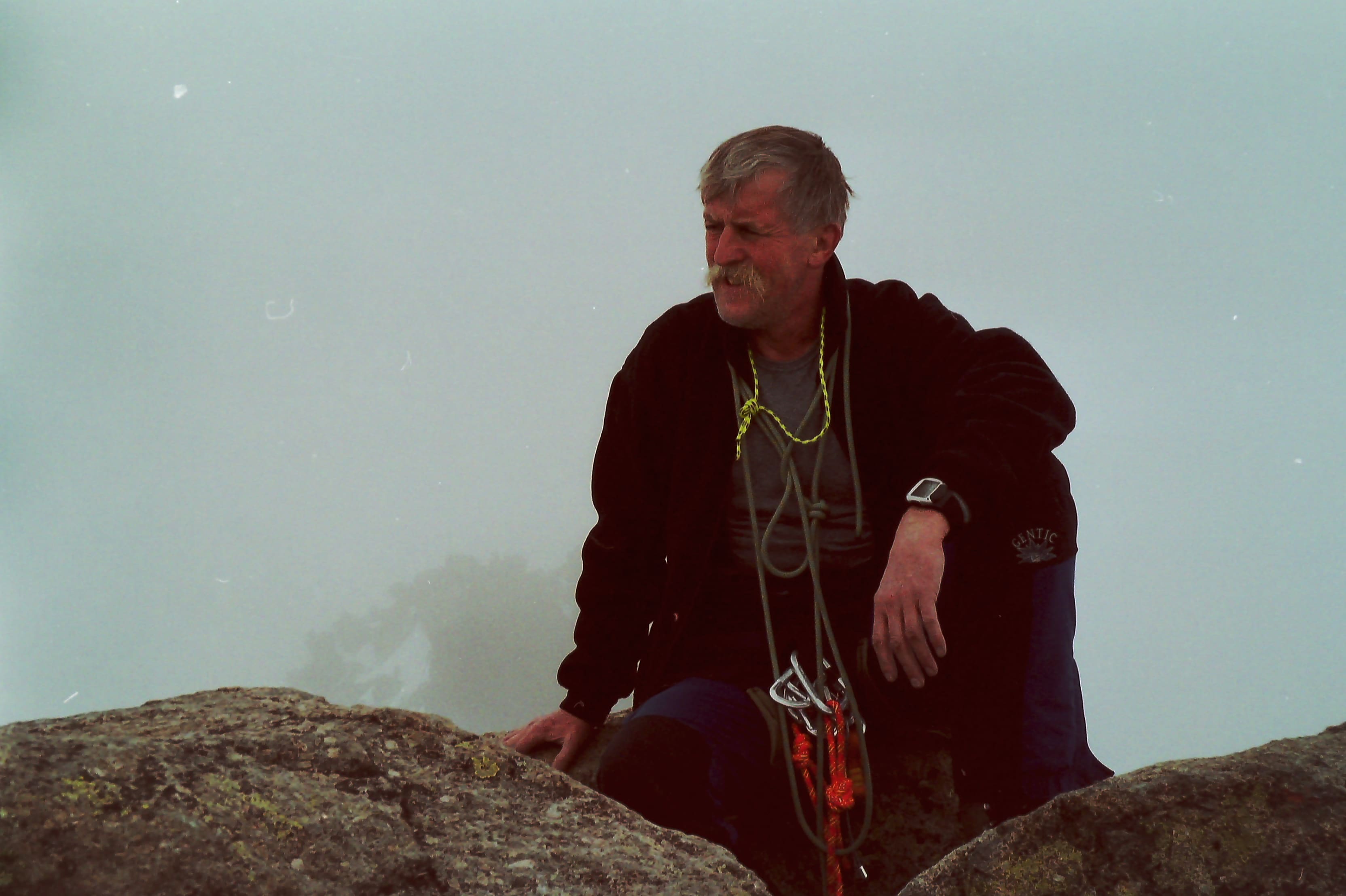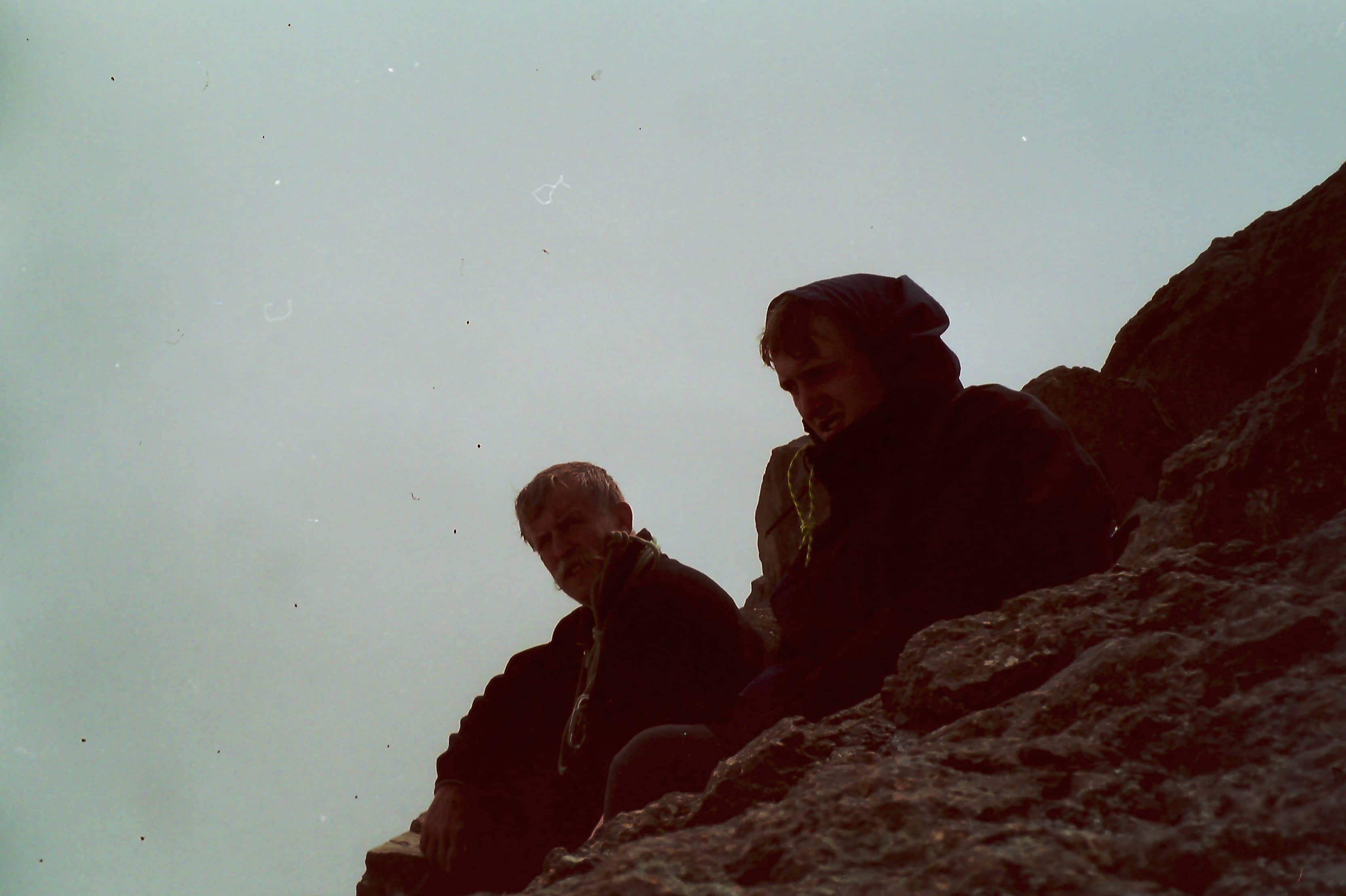 Damals blieb für solche Überlegungen nicht die Muße. Ohne Rucksack sahen wir nun nur im Rückweg den Ausweg: So gingen wir den erneuten Aufstieg über das lose Gelände an zum Col hinauf, erklommen von dort im Schneefall wieder den Gipfel des Nelion, seilten uns auf der anderen Seite mit der vollen Länge unseres fünfzig Meter langen Seils ab, ließen uns die letzten zwei fehlenden Meter zu Boden fallen. Unser Seil aber hatte sich im Feld verklemmt. Es ließ sich mit Gewalt und unter Einsatz eines Flaschenzugs zwar spannen, nicht aber herausziehen. Im Vertrauen darauf, dass unsere Reepschnüre und ein kleiner Teil des Restseils für den weiteren Abstieg genüge, schnitt ich die erreichbaren Enden des Seils ab und verknotete alles zu knapp zwanzig Metern Schnur. Doch schon bald erwies sich das abgeschnittene Seil im Abstieg als zu kurz. Es blieb uns nichts übrig: Wir mussten noch einmal hinauf, um den Rest des Seils zu holenden. Mit einer ungeheuren Kraftanstrengung gelang es mir die Stelle zu erreichen, an der sich das Seil verklemmt hatte, dort unter Einsatz des Flaschenzugs das restliche Seil zu lösen, die abgeschnittenen Enden und Reepschnüre mit dem Seilende neu zu verknoten, so dass ich abklettern und dann das Seil abziehen konnte. Mit dem wiedergewonnenen Seil kehrten wir schließlich mitten in der Nacht an den Wandfuß zurück.