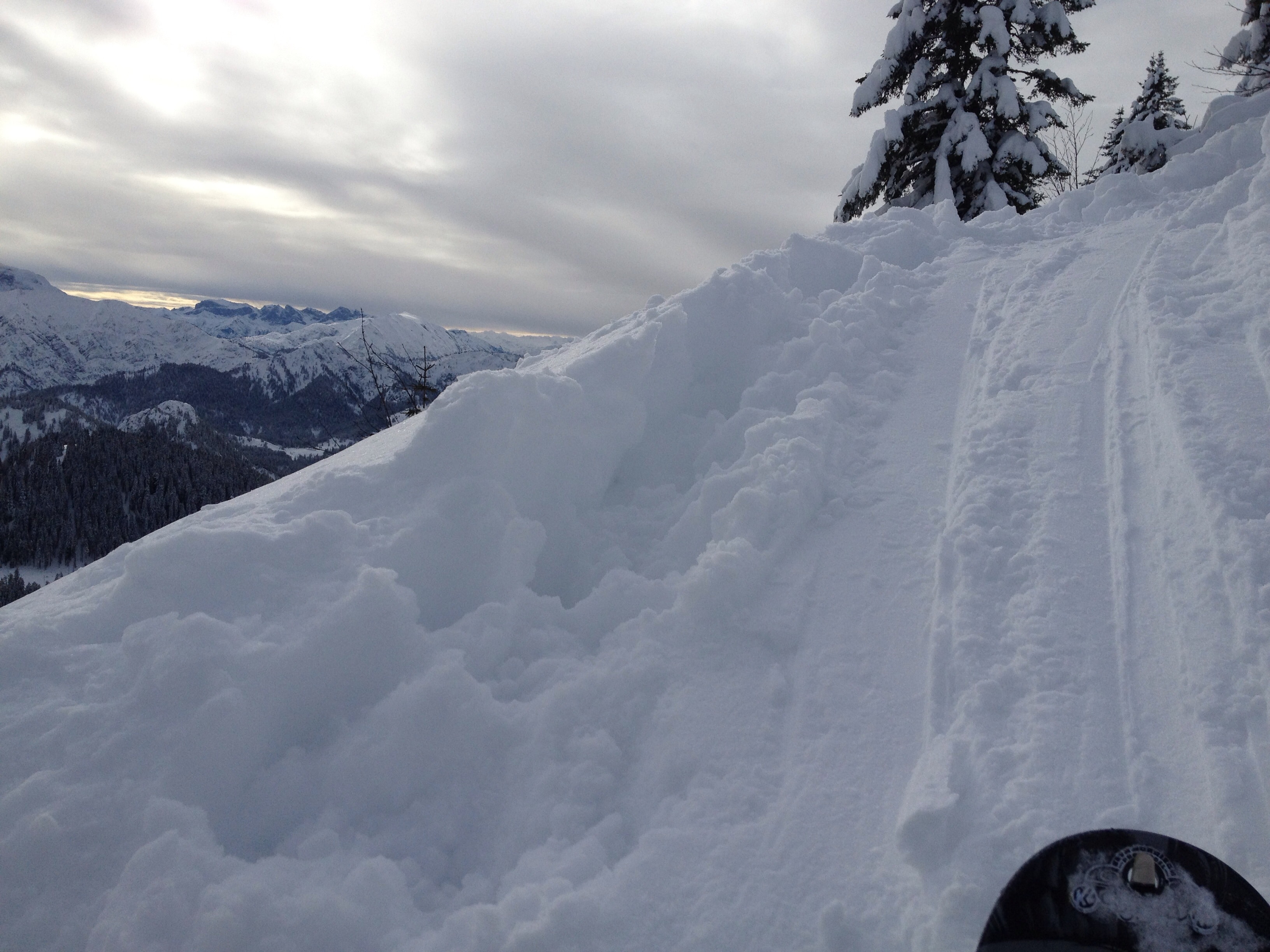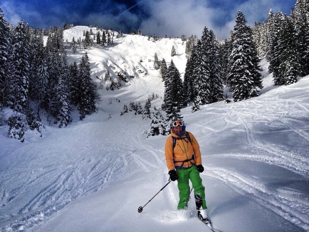 Die Abfahrt kann entlang der Aufstiegsspur oder den Hang hinab gemacht werden. Ab den Rauheckalmen immer jenseits der Aufstiegsspur im Tiefschnee abwärts. Trifft man auf die Piste, ist der Rest der Abfahrt nur hier möglich.
