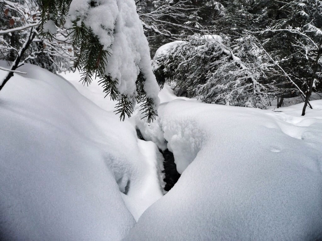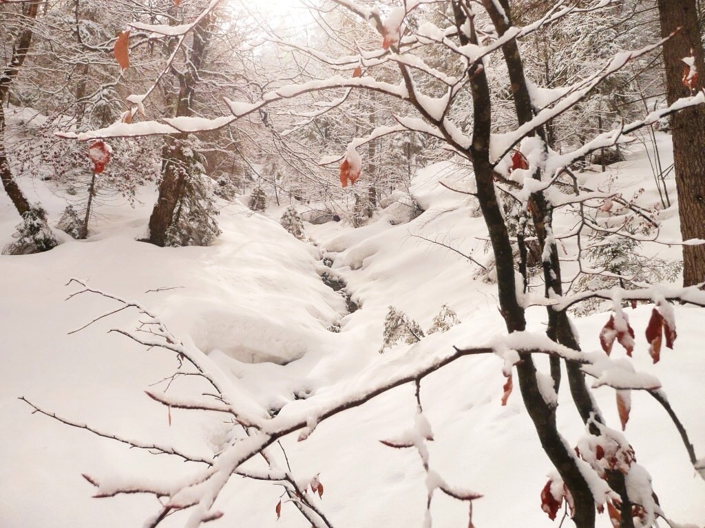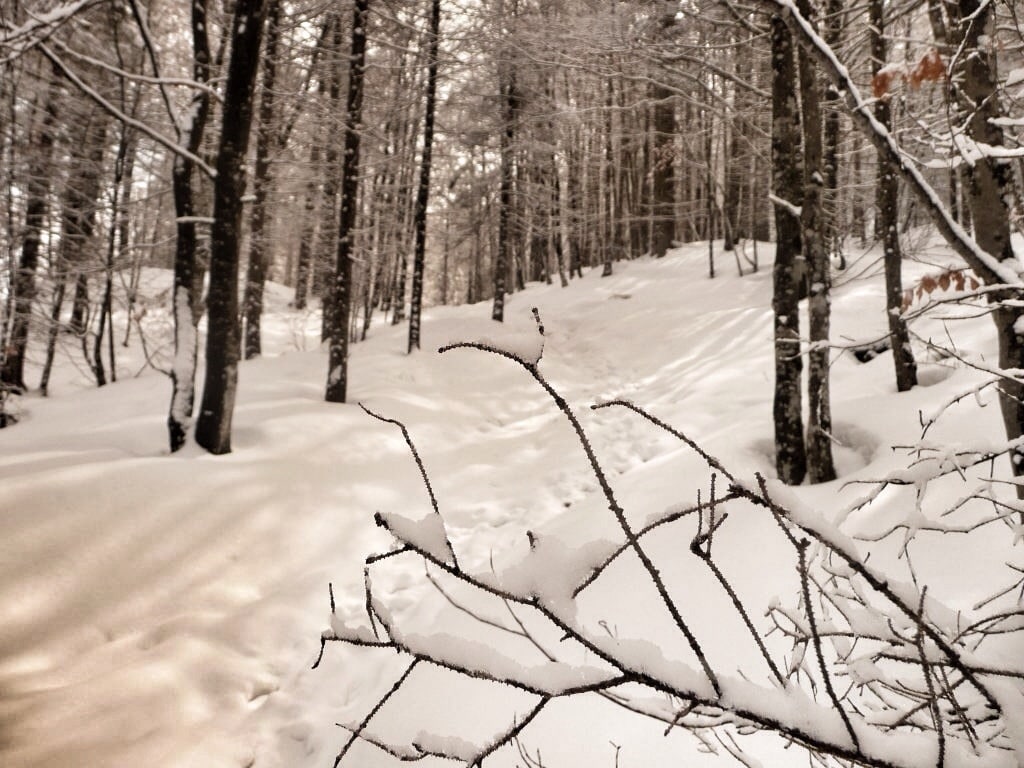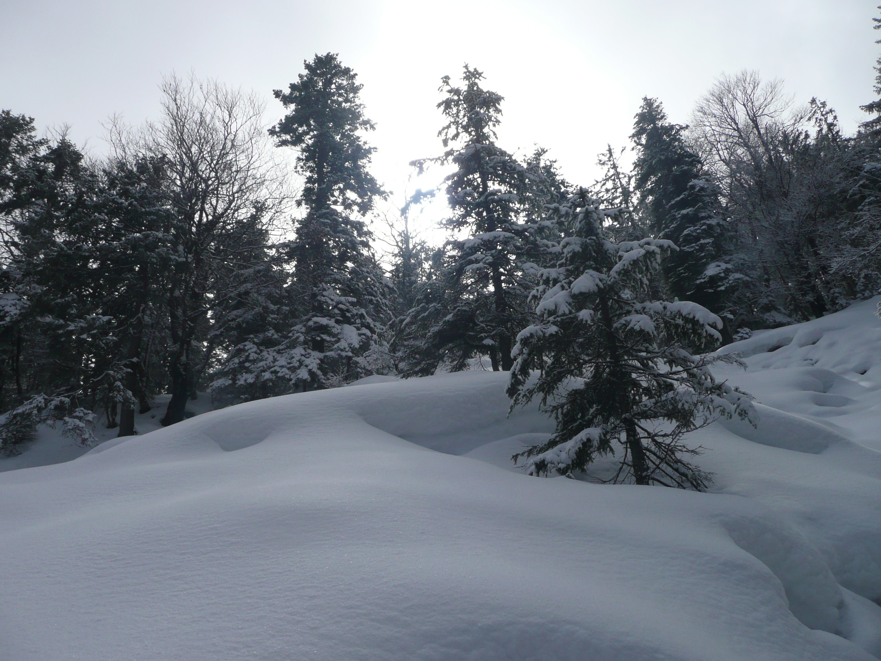 Der Aufstieg umfasst gute 900 Höhenmeter, die einem aber viel intensiver vorkommen. Vom ersten Schritt sinkt man knöcheltief in den Tiefschnee ein – ein zarte, aber bereits verschneite Spur war immerhin zu erkennen, aber keine richtige Hilfe. Und der Pfad lässt einen bis oben keine Ruhe, nur eine kleinere flachere Passage in der Mitte, das war’s. Da kommen die Probleme mit der Kleidung dann wieder zutage. Für diese Anstrengung in Kombination mit dem Wetter gibt es nichts, was die Kleiderkammer so richtig hergibt. Legt man ab, ist es zu kalt, läuft man im Softshell, schwitzt man. Und zwar richtig. Nach 400 Höhenmetern kam mir der Gedanke, das ich vielleicht zu wenig Wasser mitgenommen hatte. Aber wie sagt mein alter Bergführerfreund: “Der Alpinist ist wie ein Kamel, er trinkt vor und nach der Tour, unterwegs zerrt er davon”. Nun, Ansichts- oder Konditionssache würde ich sagen.