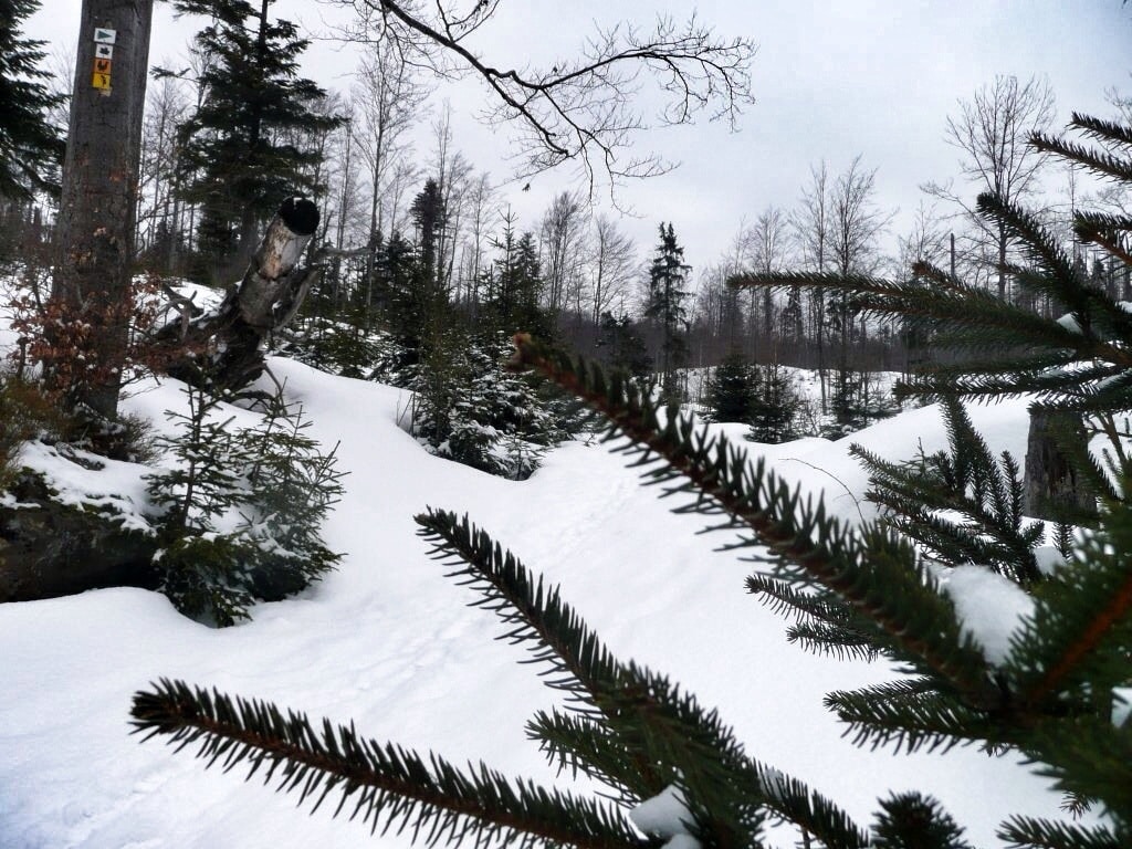 Nach gut einer Stunde erreicht man den Abzweiger Richtung Rachelsee, den man im Sommer in die Tour einbauen kann. Da der Große Rachel im April 2013 noch tief verschneit war, kann man bei einer Winterwanderung den Abzweiger auslassen und folgt ab nun dem “Auerhahn”, dem nun deutlich steiler ansteigenden Pfad Richtung Gipfel, der bald linker Hand sichtbar wird. Je nach Schneelage kann hier ein wenig Trittsicherheit und Kondition nötig sein, um nach circa 1,5 Stunden den Gipfel des Großen Rachel zu erreichen. Selbst hier oben hat der kleine Käfer gewütet und beim Blick Richtung Tschechien auf den Böhmer Wald oder Nordwesten zum Großen Arber ist von wenig Ästen, dafür umso mehr von wie Telefonmasten in den Himmel ragenden Baumstämmen gesäumt.
