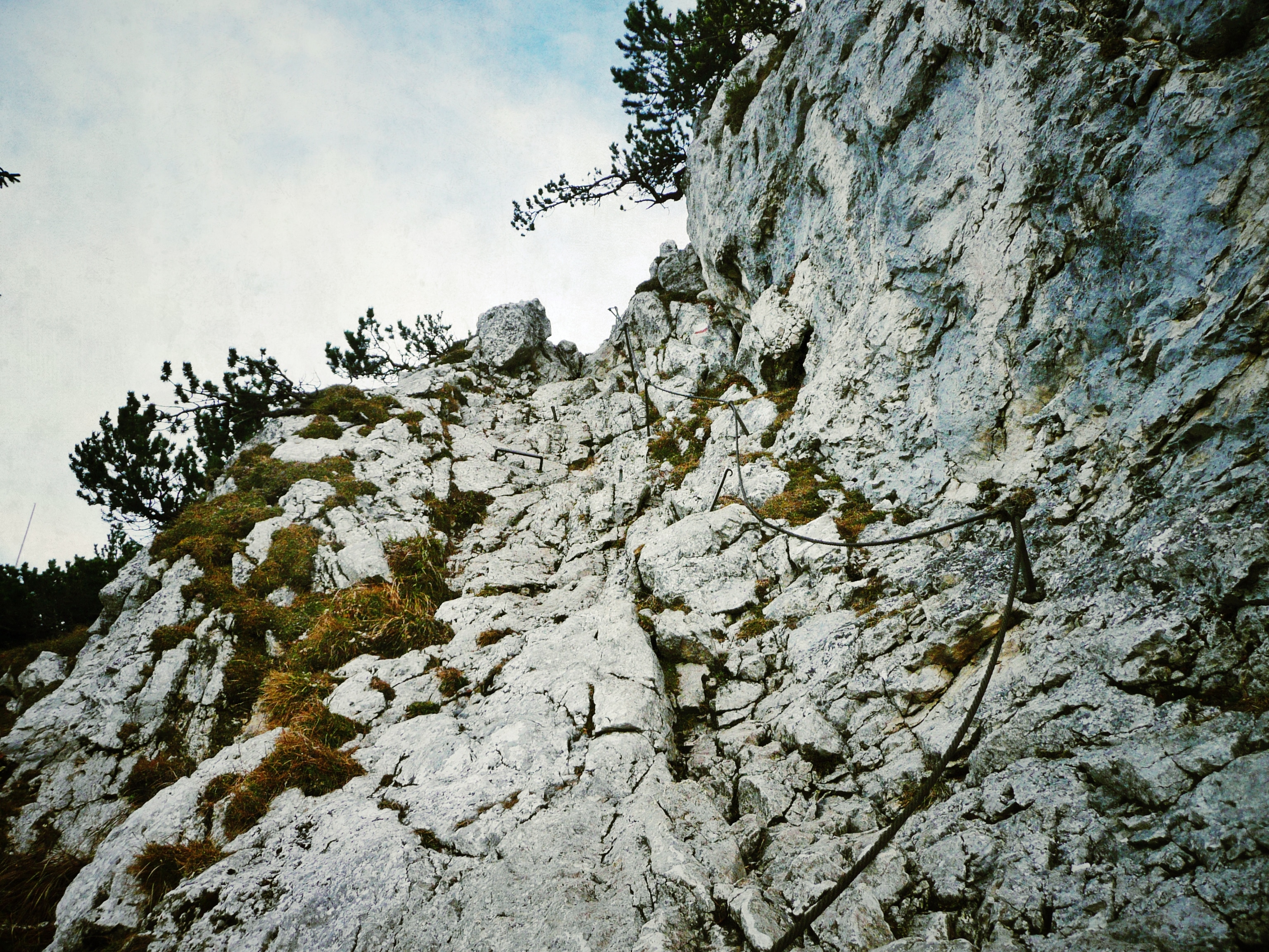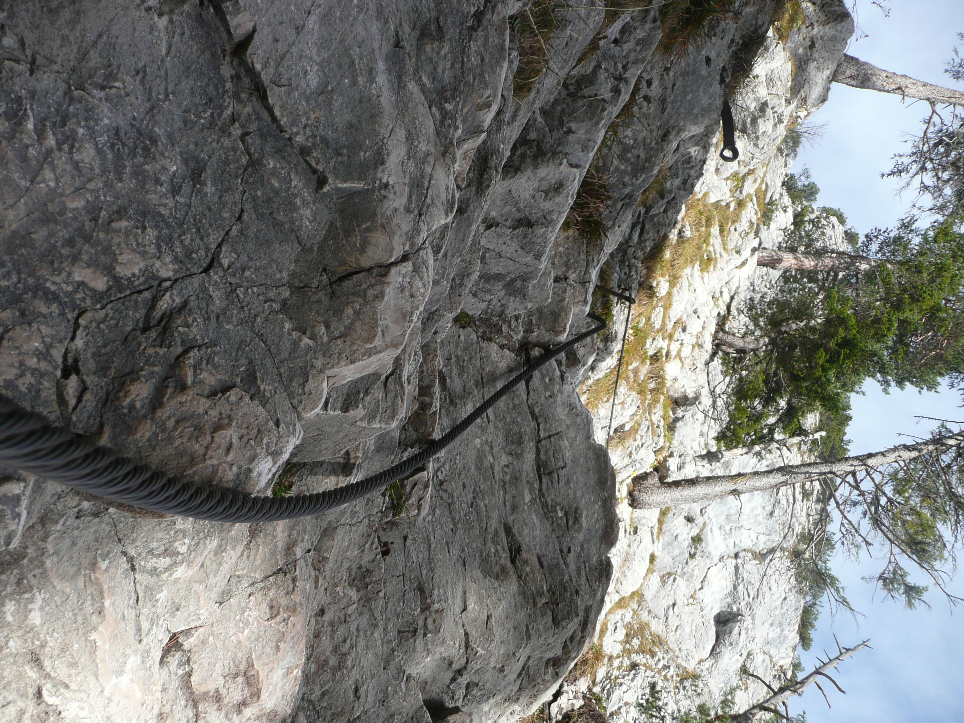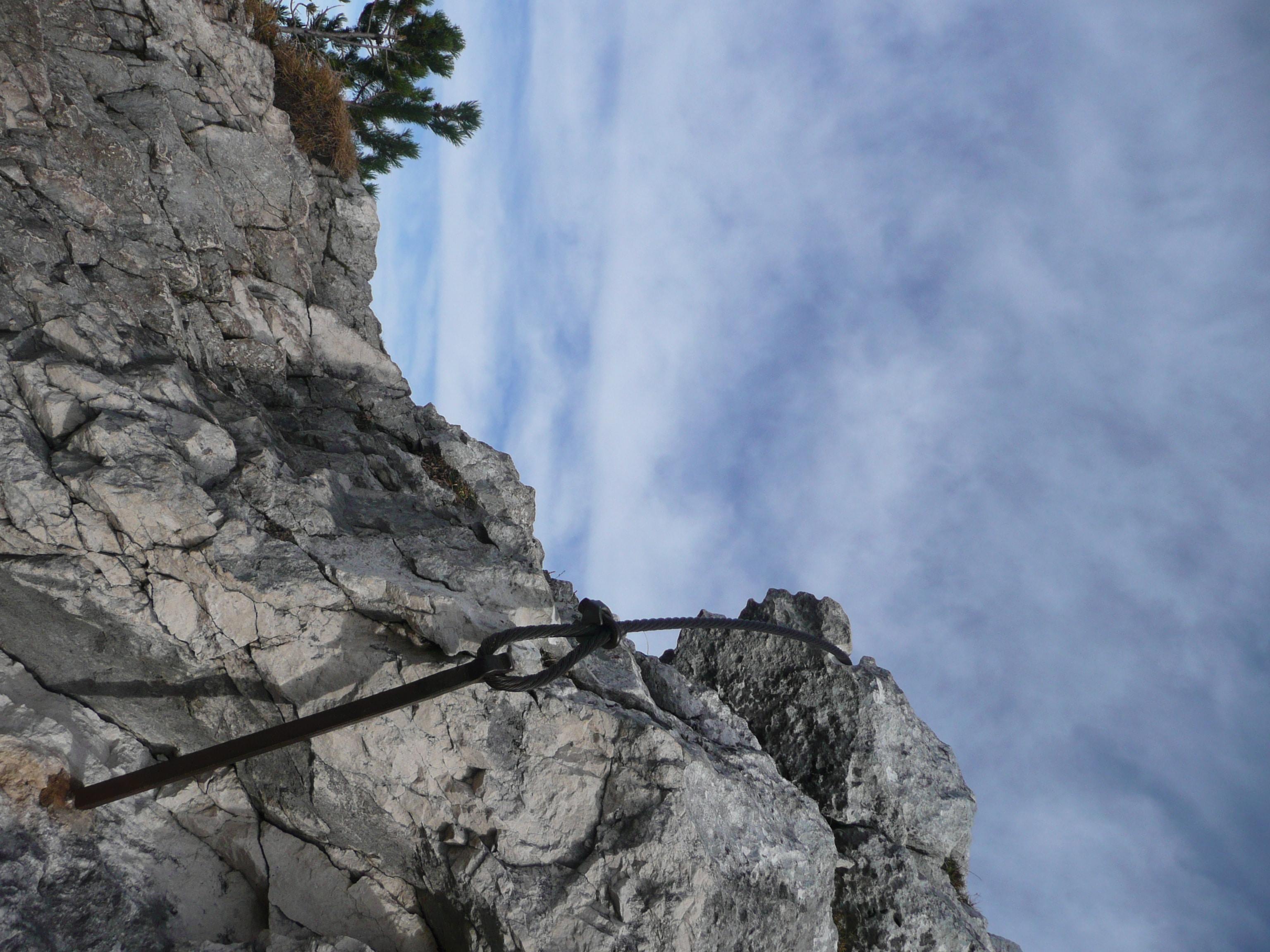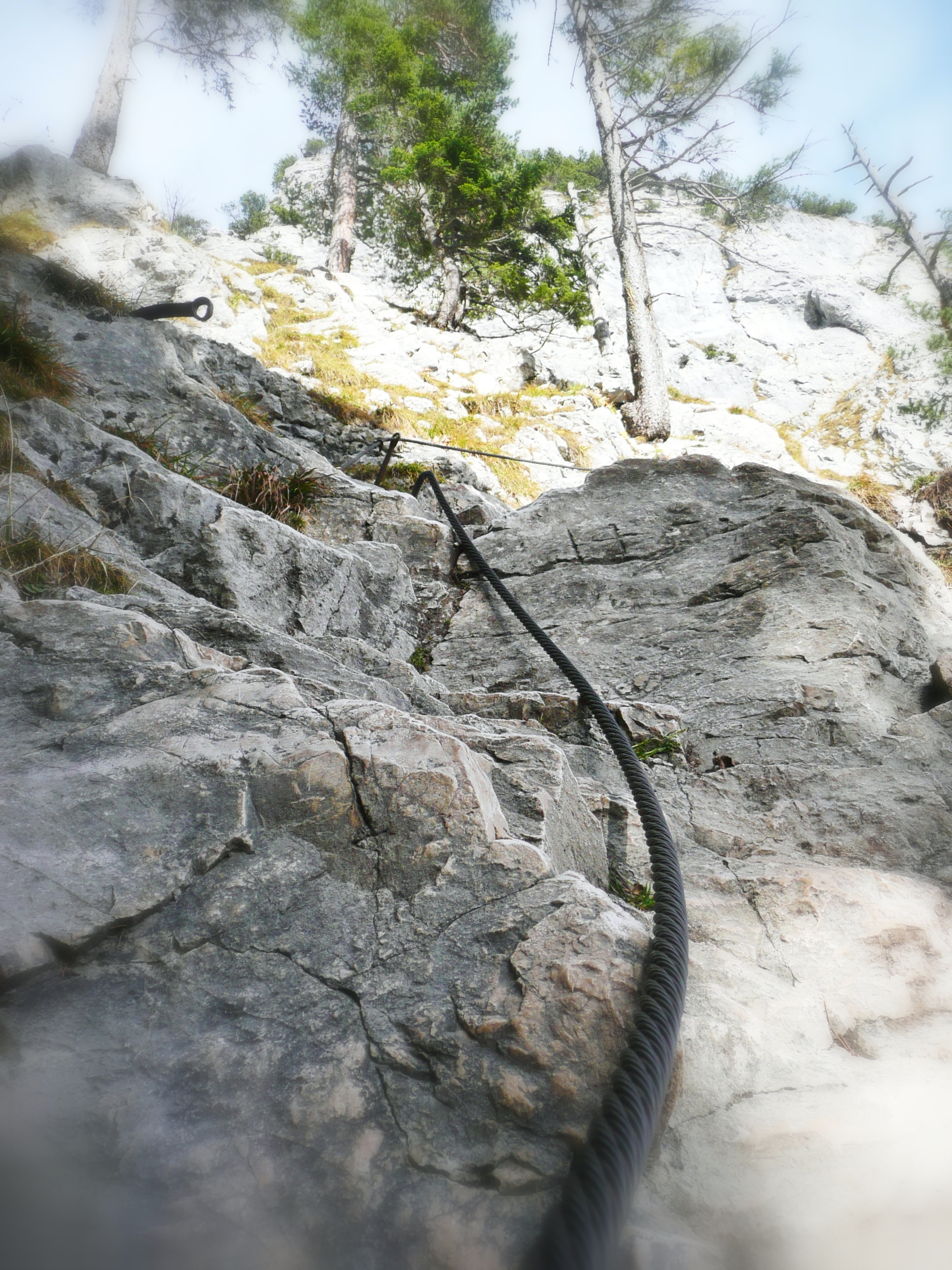 Gleichmäßig steigender Waldpfad, am Ende ein kleine Kletterpassage und schon schaut man von oben runter – und auf die umliegenden Gipfel, u.a. auf die Notkarspitze. Einige Stellen führen direkt an der Steilwand zum Kofel vorbei – hier ist Steinschlaggefahr. Helm auf oder schnell und vorsichtig passieren!
