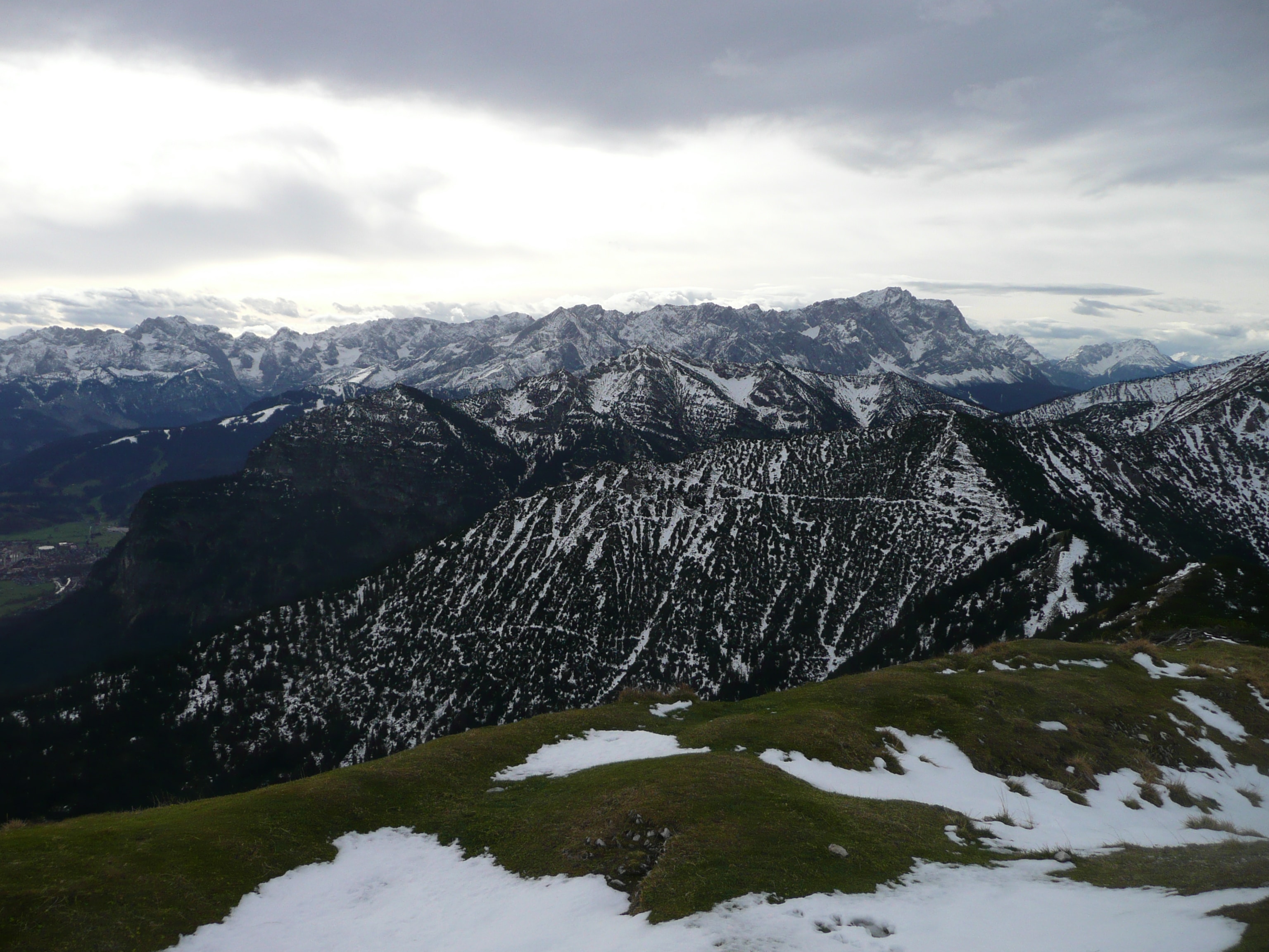 Für den Abstieg hält man sich am Gipfekreuz südlich und beginnt die Wanderung entlang des Rückens, einige Höhenmeter verlierend immer Richtung Ziegelspitz. Rechter Hand bleibt Garmisch-Partenkirchen immer im Blickfeld. Der Pfad auf dem Bergrücken und der Schlussanstieg auf die Ziegelspitz ist längst nicht mehr so steil wie der Aufstieg zur Notkarspitze – eher ein Trekking Strecke nach der man nach 45 Minuten das (momentan nicht vorhandene) Gipfelkreuz der Ziegelspitz erreicht. Der Blick auf den Laberberg und das Kloster Ettal samt Sitzbank laden zur Trinkpause ein.