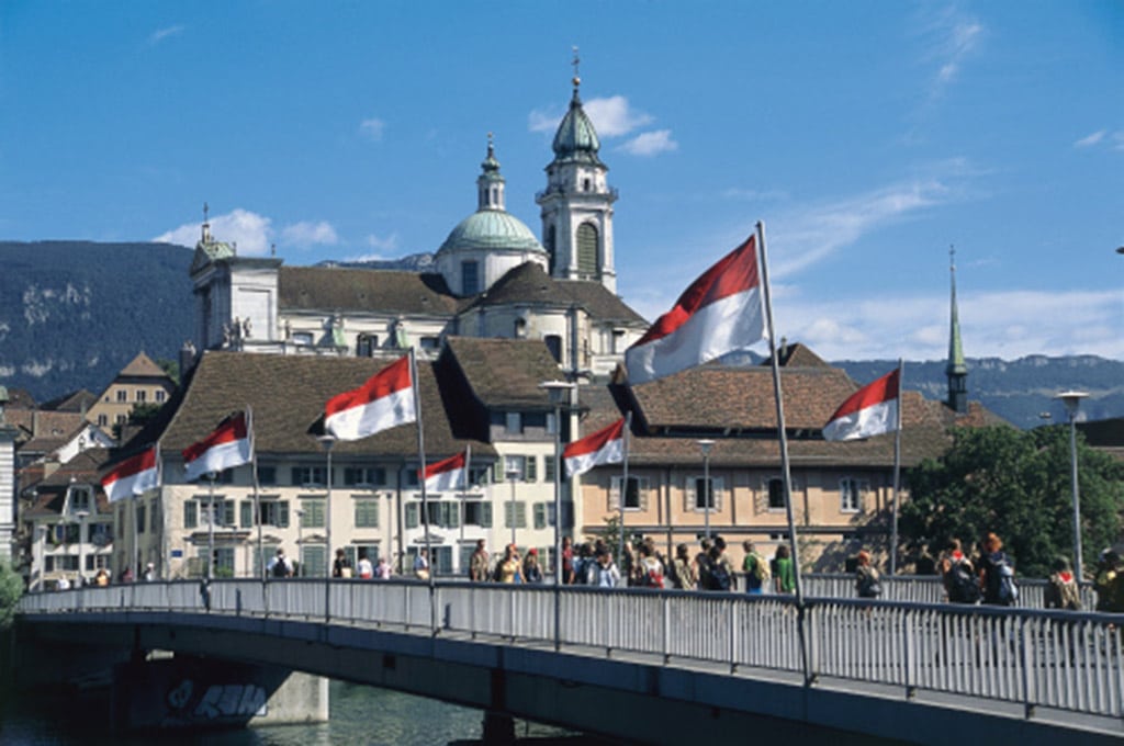 Solothurn, die schoenste Barockstadt der Schweiz. Die Kreuzacherbruecke ueber die Aare, die St. Ursen Kathedrale im Hintergrund (c) Switzerland Tourism