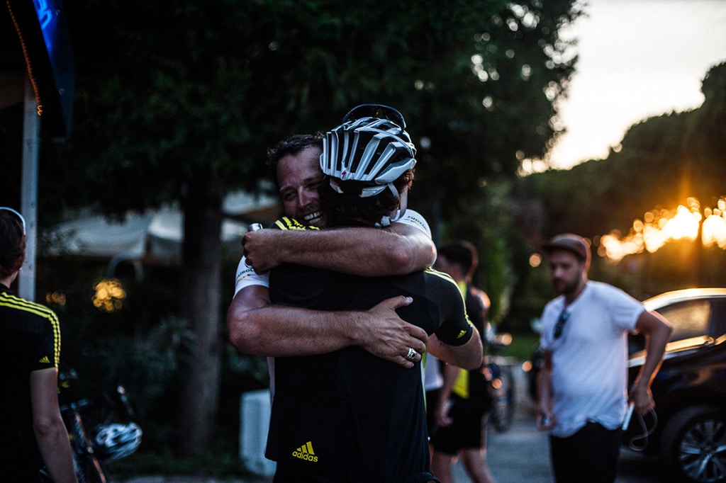 Das Schlussstück bis Bozen radelten wir mit nassen Trikots zurück. Je näher wir dem Talboden von Bozen kamen, desto mehr Wärme strömte uns entgegen. Ich verabschiedete mich bei den Acht und wünschte ihnen für die kommenden Pässe und Tage einfach nur, dass sie das Maximum an Spaß, Gesundheit und Eindrücken haben und behalten. MitHannah und Henrik vereinbarte ich, dass wir nach der Tour nochmals die Impressionen in einem Interview festhalten. Die Tour, die Etappen, die Bilder dazu, alles kann man sich auf adidasjourneys anschauen. Ein Bild sagt mehr als 1.000 Schmerzen. Als Tom mich am Sonntag vom Markusplatz anrief, und mir freudestrahlend ins Ohr rief „They did it“, war mir klar, dass sie es geschafft haben. Als Team. Gemeinsam. Jeder für sich und das Team als Ganzes hatte die „journey“ geschafft. Und irgendwie hatte ich den Eindruck, dass die Acht es gerade auf dem Markusplatz auch gebührend feierten!