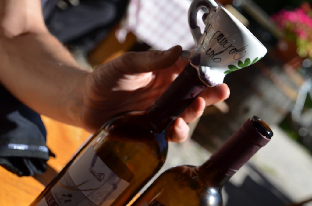 Nach der Rast geht es zur Rast. Wir rollen die letzten 10 Minuten hinauf zur Agritur Rincher. Es ist Sonntagmittag und mein Blick fällt beim „Einparken“ auf mehrere leere Weinflaschen samt Korkenarrangement. Noch ahne ich nicht, das dies Vorzeichen sind, die ich besser hätte deuten sollen …