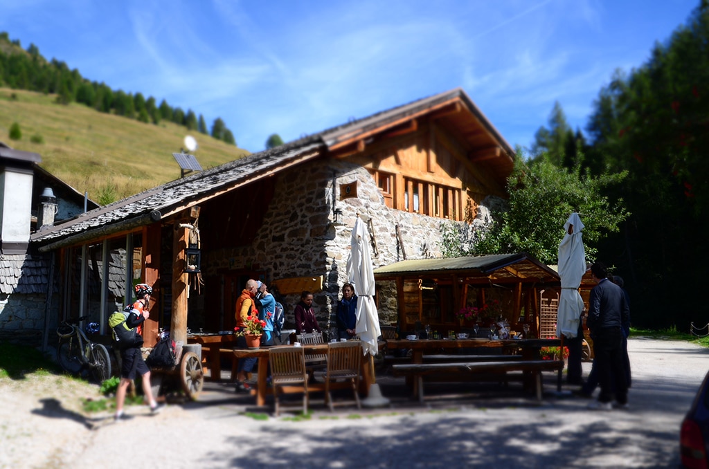 Ein Knall eines Spumante-Korkens beendet kontemplative Phase abrupt. Diego schoss einen Korken symbolisch für die Eröffnung der nun folgenden Bewirtungsphase senkrecht in die Luft und machte unmissverständlich klar, dass diese Flasche nur luftleer wieder zur Hütte darf. Noch waren nicht alle auf alkoholische Getränke eingestellt – noch. Zugegebenermaßen war die Komposition aus Aussicht, Sonne und den aufsteigenden Gerüchen aus Diego Zottele Bergküche Animation und innere Auftrag, dem Willen des Küchenchefs Folge zu leisten. Schon kurze Zeit später saßen wir auf der nun gut gefüllten Gästeterrasse und die ersten Gänge der regionalen Küche wurden mit entsprechenden Erläuterungen auf Italienisch serviert. Auf Berg- oder Mountainbiketouren esse ich in der Regel unterwegs gar nichts bis ein wenig Gemüse oder Obst. Dieses Volumen wurde schon mehrfach von Diegos Vorspeisenbuffet aus selbst hergestellten Käsen und Schinken überflügelt. Weitere Korken, nun vom hauseigenen Rotwein (sehr zu empfehlen), zierten schnell die Tischdecke und immer wieder öffnete sich die Küchentür, und neue Platten, Pfannen und Schüsseln fanden Platz auf dem gerade freigeräumten Tisch. Stets machte der Hausherr unmissverständlich und nachhaltig deutlich, dass hier alle servierten Gefäße erst das Spülwasser erblicken, nach dem sie geleert worden sind. Etwas Panik in den Blicken mischte sich mit dem vorzüglichen Genuss seiner Pasta-Variationen. Noch während die Gruppe über mögliche Fluchtwege diskutierte oder die Frage erörterte, ob es einen Secondi-Secondi Pati gibt, wurden die preisgekrönte Haupt (Haupt)-Speisen serviert. Eine Art überbackener Fladenkuchen in verschiedenen Variationen: Nur Käse, mit Speck oder Schafskäse – zum Käse. Der „Point of no return“ war erreicht, es gab buchstäblich kein Zurück mehr. Allein der Wille reichte nicht, um der Masse an Speisen Herr zu werden. Als Seniore Zottele diese „Angst vor dem Feind“ bemerkt, kramte er höchst selbst einen Art holzartigen Vorschlaghammer hinter einer Balustrade hervor. Das stumpfe Ende schlug auf einem Klotz circa ein Meter neben mir ein. „Mangiare, tutto!“.