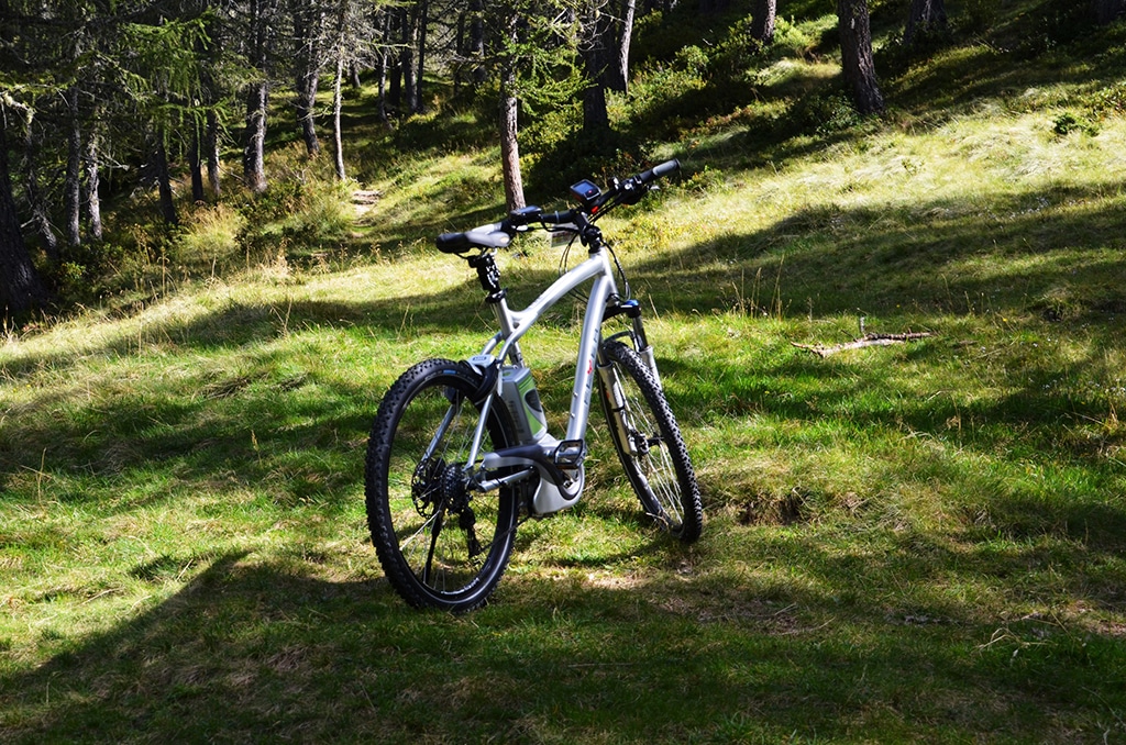 Mein erstes Mal – wirklich. Nicht ganz, ich war schon mal auf der Eurobike mit einem E-Bike auf einer kleinen Runde unterwegs, aber noch nie länger als 5 Minuten und 500 Meter. Etwas erwartungsfroh baute ich mich also vor der E-Bike Anordnung auf. Alle Räder vom Top-Hersteller in diesem Segment, Flyer, und alle optisch bestens in Schuss. Technisch halten die durch, da bin ich mir sicher, nicht so sehr bei der Auswahl meiner Kleidung. Gibt es E-Bike Kleidung? Schließlich war meine Erwartung, dass man nicht sonderlich viel Feuchtigkeit nach Außen transportieren muss. Letztlich muss man doch treten, und so nahm ich die Herausforderung in normaler Mountainbike-Montur an. Bert, unser Guide von Trentino Sport, der die ganze Saison schon in der Gegend auf dem Sattel verbracht hat, mahnt zum Aufbruch. Etwas unsicher war ich mir wegen der Planung. Gut 1.000 Höhenmeter auf 50 Kilometer stand im Briefing. Das kurbelt man mit normalem Bike und Pause in 3-4 Stunden weg, warum also die Eile? Aber die Aufklärung zum straffen Zeitplan kommt später! Bevor es aber das Aufsatteln ansteht, ging es gut 600 Höhenmeter von Levico Terme nach Vetriolo Terme auf eine Passhöhe am Berg Panarotta mit dem Transporter hinauf. „Schade eigentlich“ deswegen sind wir doch hier – zum Biken. Aber Zeitplan ist Zeitplan, also auf gut 1.600 Meter meinen mir zugeteilten silbernen Flyer etwas genauer inspiziert. Erste Überraschung: Einfach treten geht nicht. Zunächst mal muss man den „Anlasser“ betätigen, und der befindet sich wie bei einem Motorrad links am Lenker. Nach kurzer Zeit ist das E-System hochgefahren und ich kann mich zwischen drei Einstellungen entscheiden: Eco, Standard und High. „Standard ist gut zum einfahren“ denke ich, trete .. nein .. rolle los.