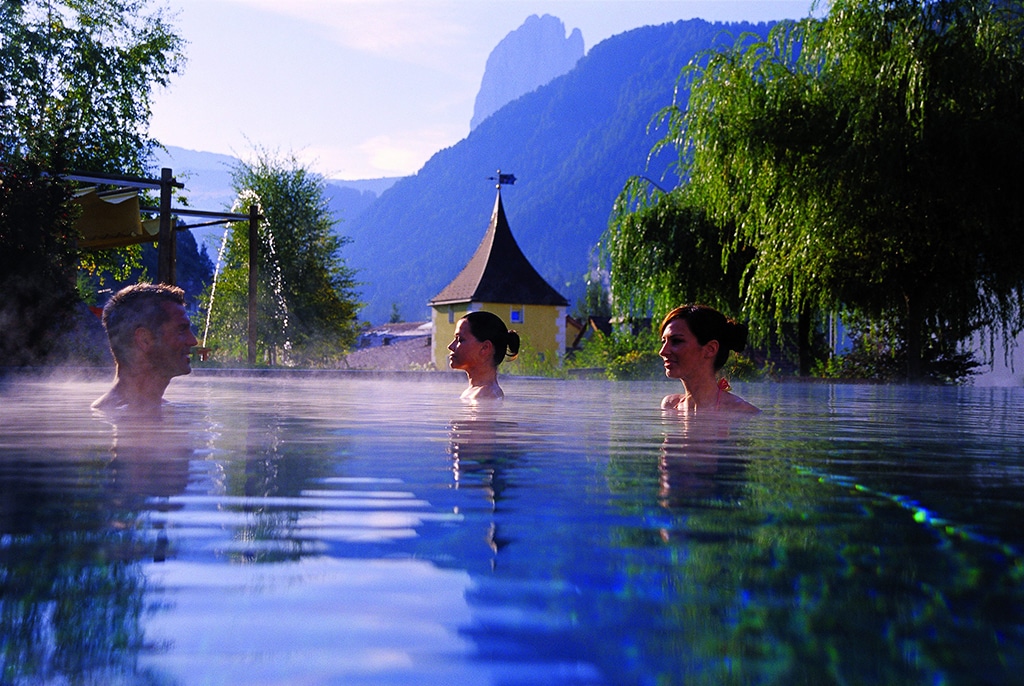 Nach der „Durchschreitung“ einer kleinen Galerie mit Bildern und Ausstellungsstücken aus der Region erreiche ich sie, die Wasserwelt des Hotels. Ich bin Bergmensch, kein Wassermensch, wie ich erst später in meinem Leben festgestellt habe, aber das hier werde ich erkunden: Hallenbad, Kristall-Pool, Whirlpoolanlage – und, der ultimative Grund, das ich die Badehose gleich aus dem Zimmer holen werde: Ein beheizter Außenpool mit Blick auf die Sellagruppe und den Langkofel. Die ganze Poollandschaft ist eingebettet in eine riesige Parkanlage mit Liegen und kleinen Tischen zum Entspannen. Verschiedene Schilder, wie ich sie sonst nur aus der Bergwelt kenne, geben Hinweise auf eine Wasserwelt, die man in Ruhetagen entdecken kann: Alm-Sauna, Südtiroler Heubad, Kraxenofen. Man muss sich also Zeit nehmen oder sich auskennen. „Wie auf dem Berg“ denke ich. Doppelacht und Prusik sind eher meine Welt, aber der Entschluss steht. Ich werde in diesem Pool springen, alleine schon wegen des Berges im Hintergrund!