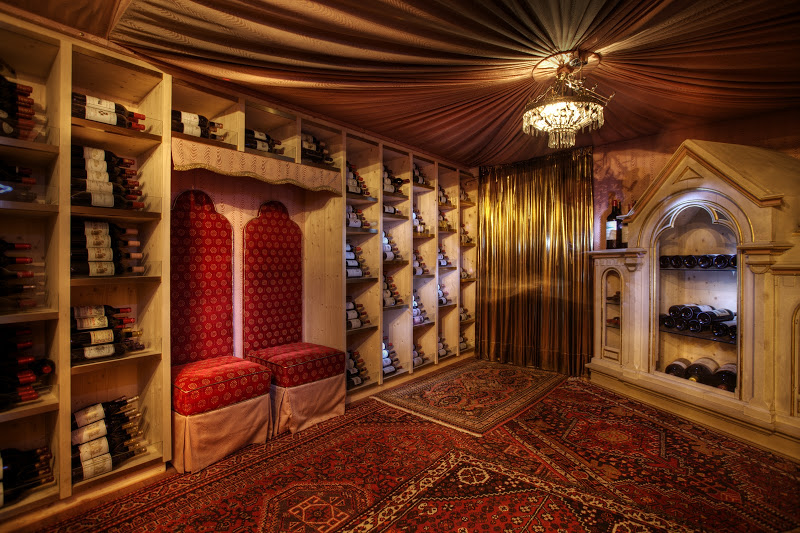 Wer schon mal in Weinkellern eine Verkostung mitgemacht hat, und mit dieser Erwartung in den Hauskeller des „La Perla“ hinuntersteigt, wird irritiert sein. Die Reise durch die etwa 30.000 Weinflaschen des Hauses hat eine andere Mission, als die, sich durch die unterschiedlichen Weiß- und Rotweine aus aller Welt zu probieren. Gleich nach dem Eintritt durch die gut versicherte Stahltür beginnt eine Reise, die zum Nachdenken denn zum Trinken anregen soll. Sinnbildlich steht am Eingang eine Lesebrille zur Verfügung – Sinne und Augen schärfen, für das, was im Laufe der 30 minütigen Führung auf einen zukommt. “Das Leben ist ein Auf und Ab – keine gerade Linie“. Gleich im ersten Raum offenbart sich diese „Mission“ des Weinkellers. Gleichnisse, Lebenserfahrungen, spirituelle Gedanken – all das haben die drei Hoteliers für einen bereitgestellt. Wer sich zu seinem Lieblingsrotwein aufmacht, der muss sich beispielsweise auf unebenen, schrägen oder nachgebenden Kellerwegen dorthin bewegen. Das Licht wird dazu gedimmt und der Sommelier gibt Denkanstöße, was die Hausherren mit bewegt hat, den Gast gedanklich zu lenken. Jeder Raum, eine Geschichte. Jede Region eine Symbolik, zusammen bündeln sie wahrscheinlich das, was Michil Costa über die Zusammenhänge auf diesem Globus denkt. “Wir denken zu wenig – über uns, über andere, über den Planeten, auf dem wir Gast sind und über das, was wir verändern können”.