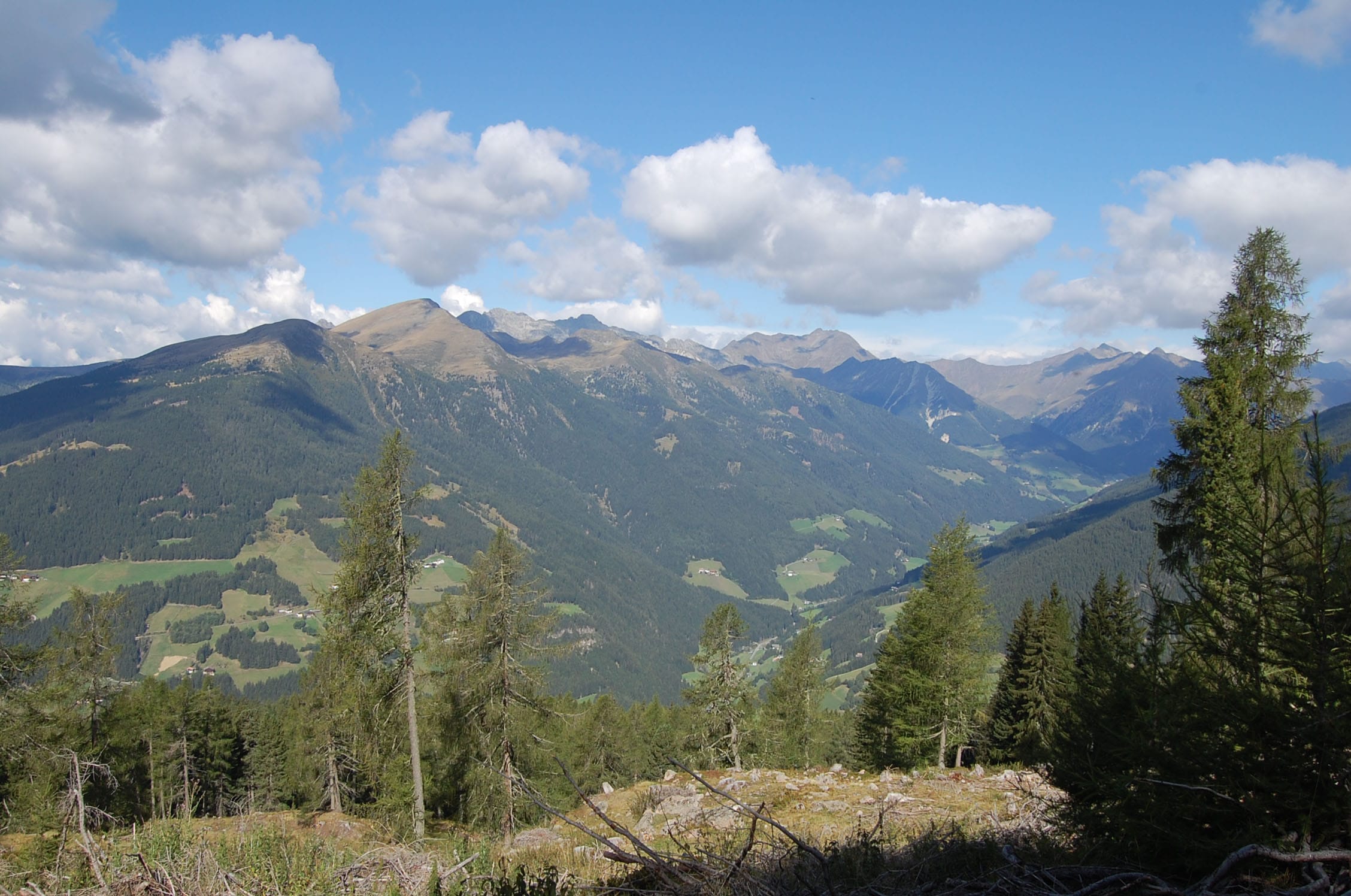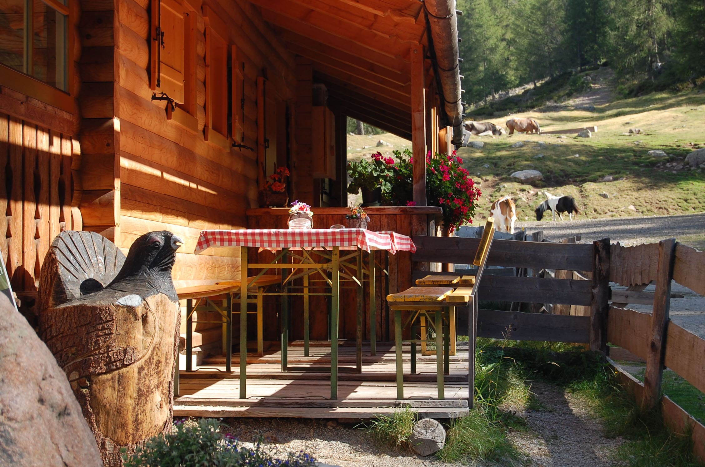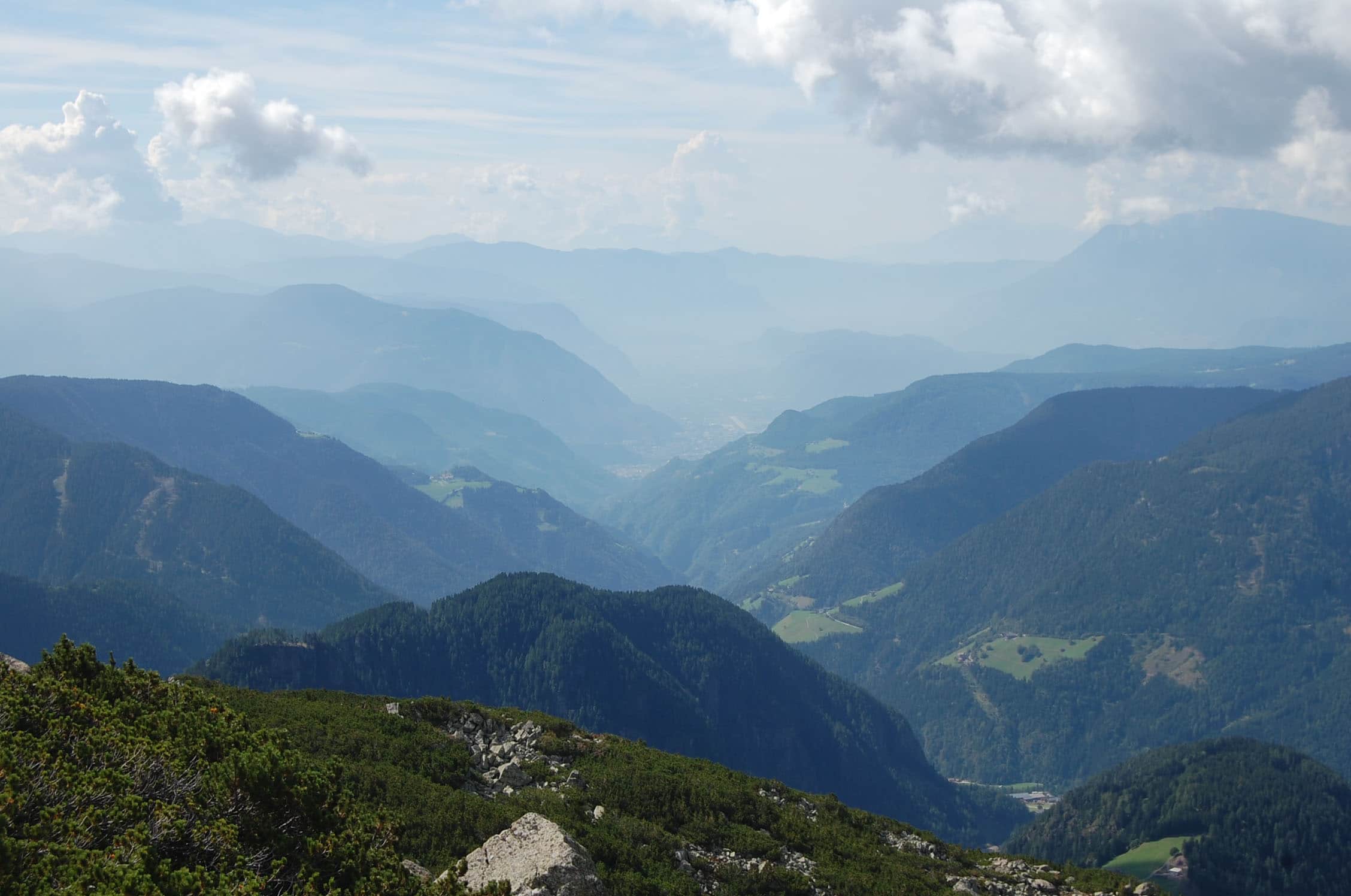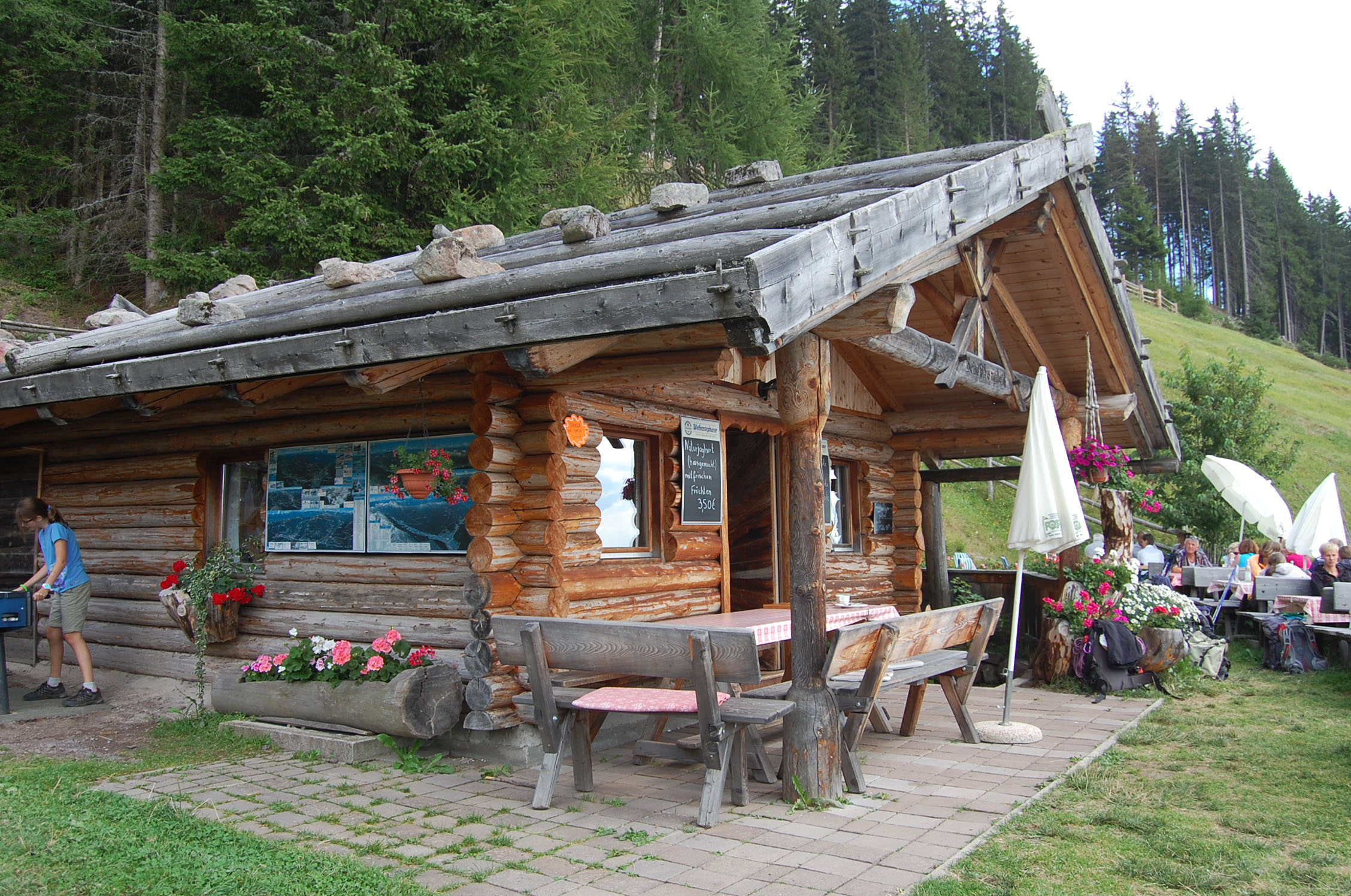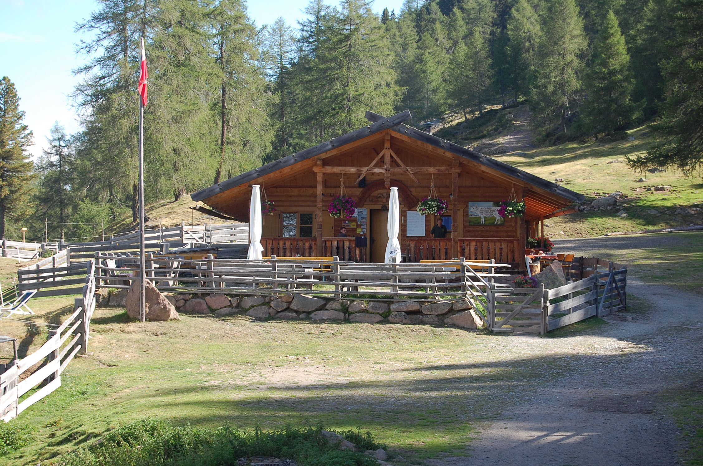 Wir parken das Auto leicht erhöht von Sarntal, um ein paar Meter Aufstieg auf Asphalt zu sparen. Es ist ein Samstag und nur wenige Wanderer haben sich ob des Festes auf dem Wanderparkplatz verlaufen. Wir steigen mit einer kleinen Jause im Gepäck und bei bestem Sonnenwetter empor. Unterwegs erhalte ich ein paar Fakten zur Wanderregion Sarntal: Über 500 Kilometer markierte Wege und 140 Gipfel lassen sich erwandern und erbiken. Für Einsteiger gibt es im Tal leichte und beschauliche Ausflüge mit geringer Steigung, wer sich in höhere Lagen begibt, kann ein voralpines Panorama samt Bergwelt genießen. Urige Hütten und ursprüngliche Almen durchziehen die flächenmäßig größte zusammenhängende Gemeinde Südtirols. Und genau von den urigen Berghütten können wir uns bereits nach 30 Minuten überzeugen. Das laute „Muh“ einiger Kühe kündigen die erste Almwirtschaft an, die herrlich in der Sonne liegt und zur Jause einlädt. Die „Waldrast-Hütte“ kommt für uns zu früh, wir nehmen einen Abzweiger an zwei Eseln vorbei uns steigen nun etwas steiler in Richtung Sarner Scharte. Nach gut einer Stunde geht der Mischwald deutlich zurück und der Blick von aus einem Latschenkieferhain hinab ins Tal und auf einen oktoberfestartigen Parkplatz wird frei. Hier müssen alle 6.951 Einwohner des Tals parken und auf dem benachbarten Kirchtag feiern. Besser das Auto bleibt auch dort stehen – in Italien konfisziert der Staat das Auto, fährt man betrunken mit dem eigenen PKW.