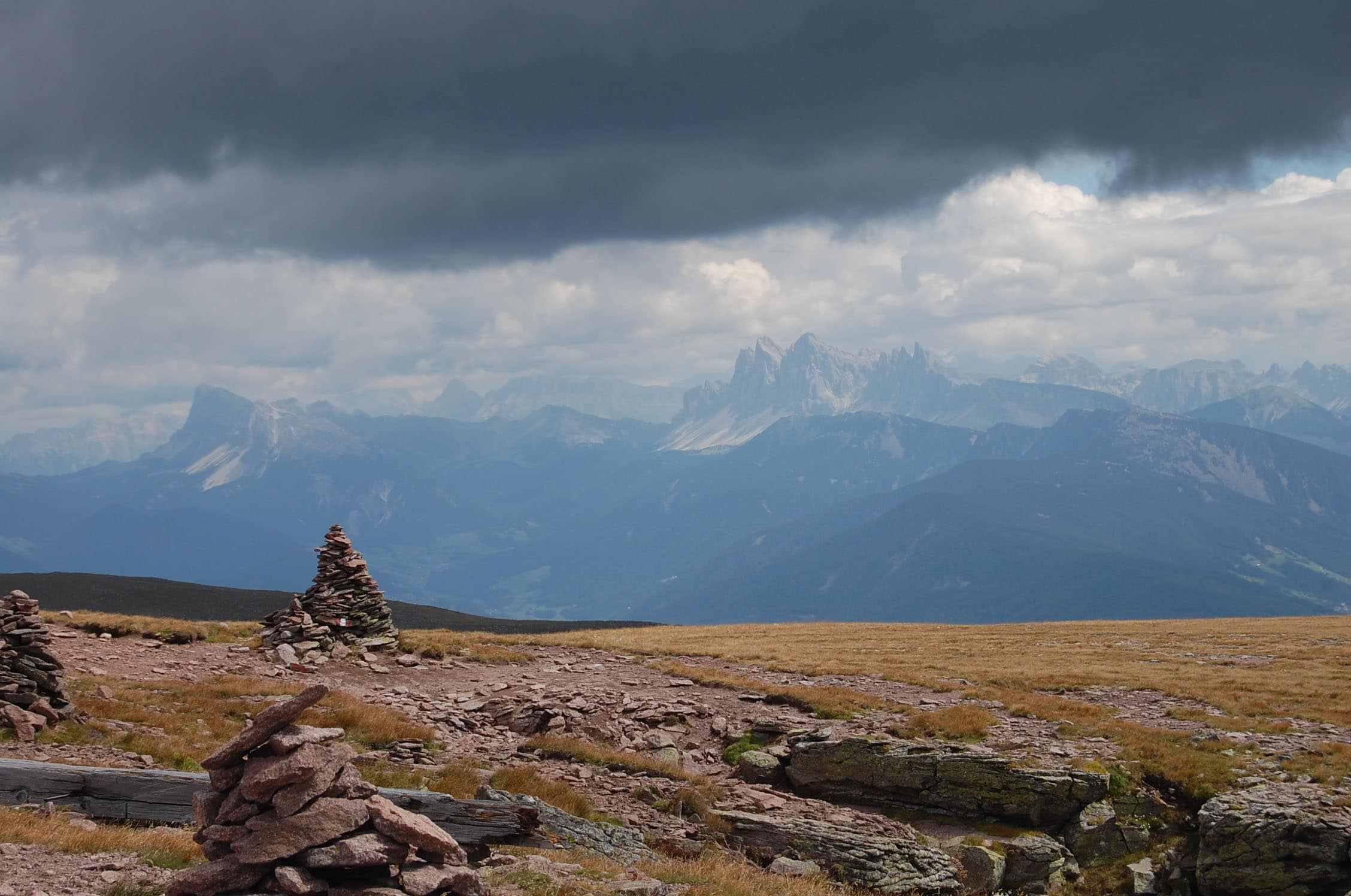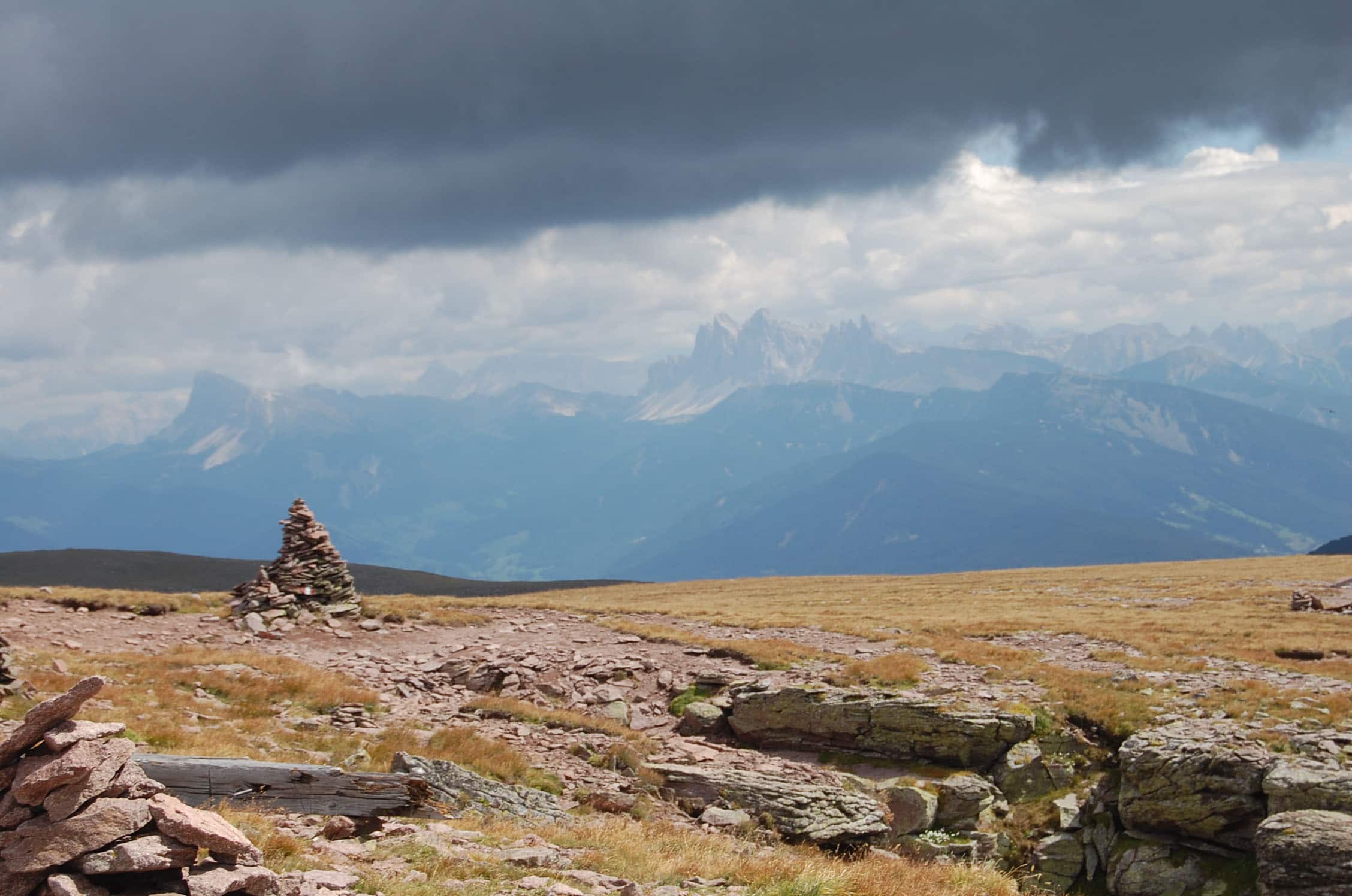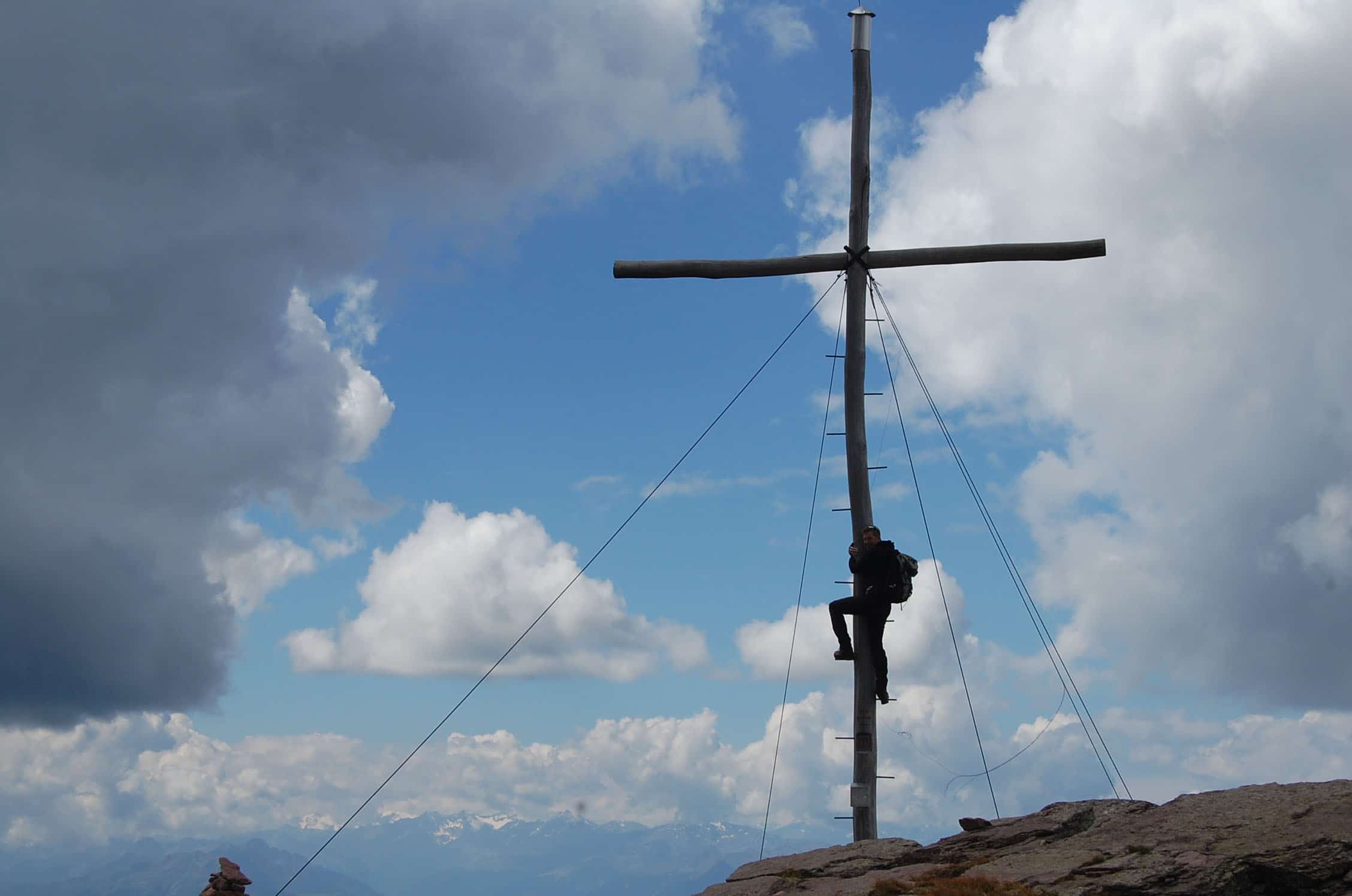 Gemütlich schlendern wir zum ersten Gipfel. Von unten hat der Berg noch eine richtige „Westwand“, die durchaus Eindruck macht, von oben geht der Bergrücken und ein flaches Plateau über und man kann das gesamte Sarntal und die gegenüberliegenden Dolomiten erblicken. Schlern, Rosengarten, Sellastock, Geisler-Gruppe, Marmolata – wie auf einer Fototapete reihen sich die Klassiker vor unseren Augen auf. Den Villandersberg haken wir schnell ab – einer von den 140 Gipfeln wäre dann schon mal weg. Drüben blitzt schon das riesige Kreuz der Sarner Scharte, die wir gut 30 Minuten später erreichen. Nahe des Kreuzes bauen sich jede Menge Steinmandl auf – es sieht aus wie Steingarten auf 2.500 Metern. Das zweite Gipfelkreuz nehme ich dann richtig. Wie auf einem Dreimaster zum Ausguck sind Tritte befestigt, klar, dass die erstürmt werden müssen.