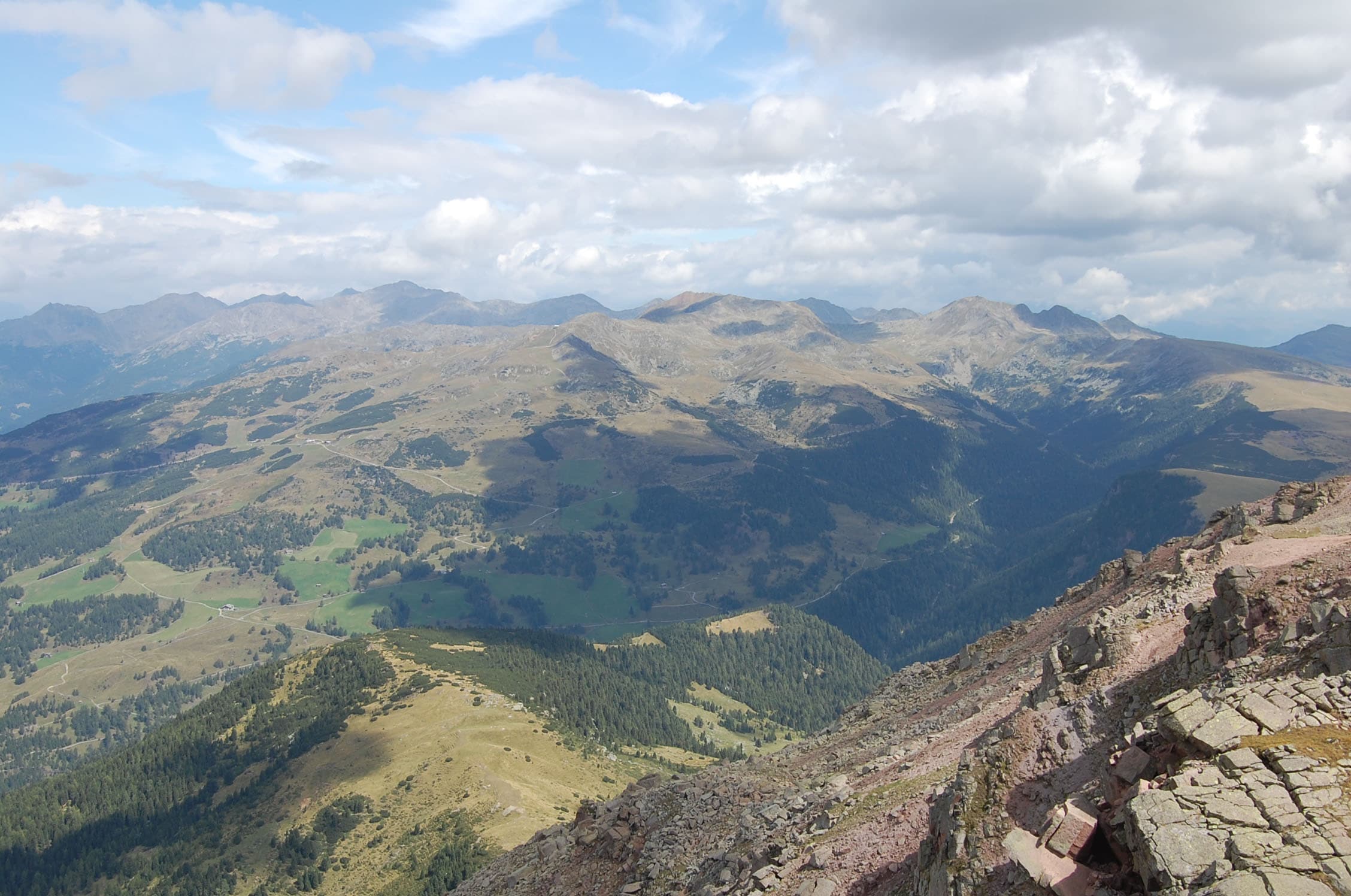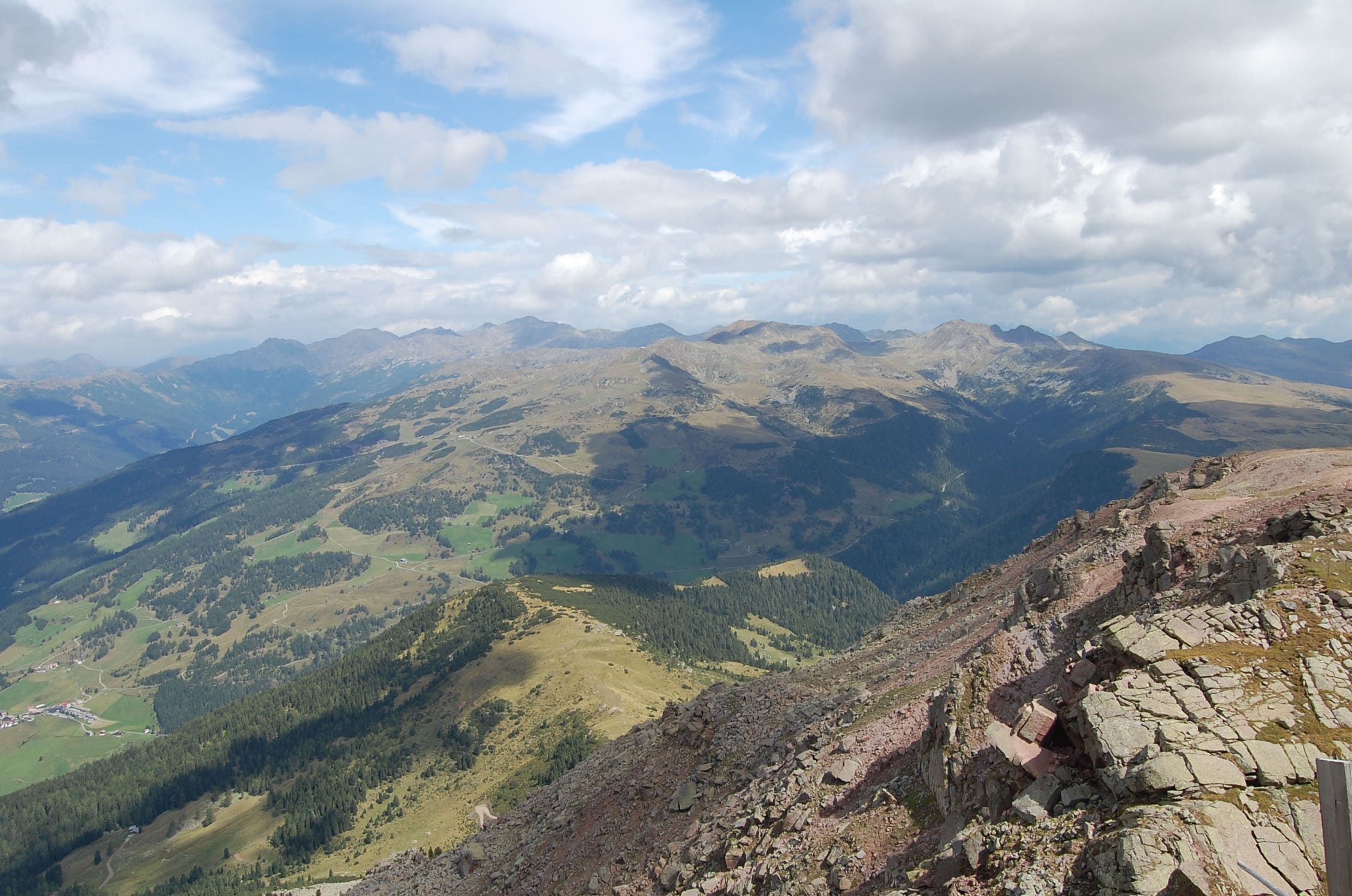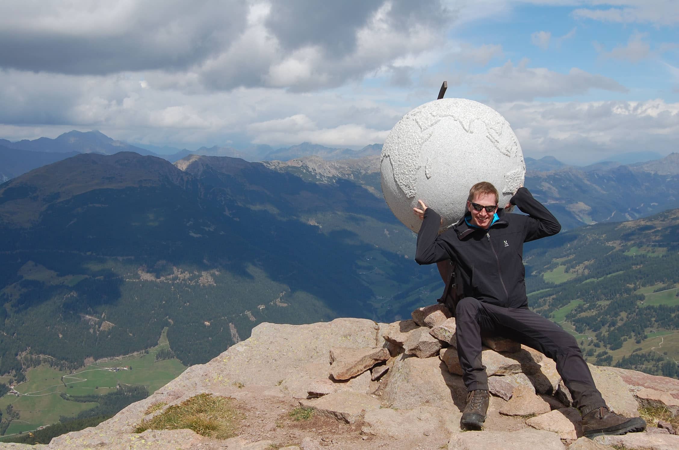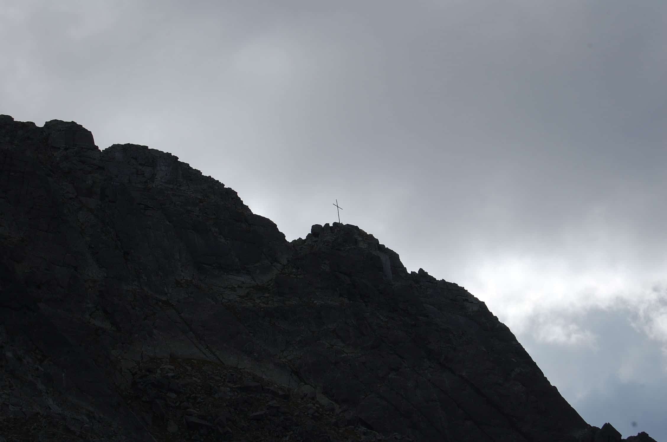 Gemütlich schlendern wir zum ersten Gipfel. Von unten hat der Berg noch eine richtige „Westwand“, die durchaus Eindruck macht, von oben geht der Bergrücken und ein flaches Plateau über und man kann das gesamte Sarntal und die gegenüberliegenden Dolomiten erblicken. Schlern, Rosengarten, Sellastock, Geisler-Gruppe, Marmolata – wie auf einer Fototapete reihen sich die Klassiker vor unseren Augen auf. Den Villandersberg haken wir schnell ab – einer von den 140 Gipfeln wäre dann schon mal weg. Drüben blitzt schon das riesige Kreuz der Sarner Scharte, die wir gut 30 Minuten später erreichen. Nahe des Kreuzes bauen sich jede Menge Steinmandl auf – es sieht aus wie Steingarten auf 2.500 Metern. Das zweite Gipfelkreuz nehme ich dann richtig. Wie auf einem Dreimaster zum Ausguck sind Tritte befestigt, klar, dass die erstürmt werden müssen.