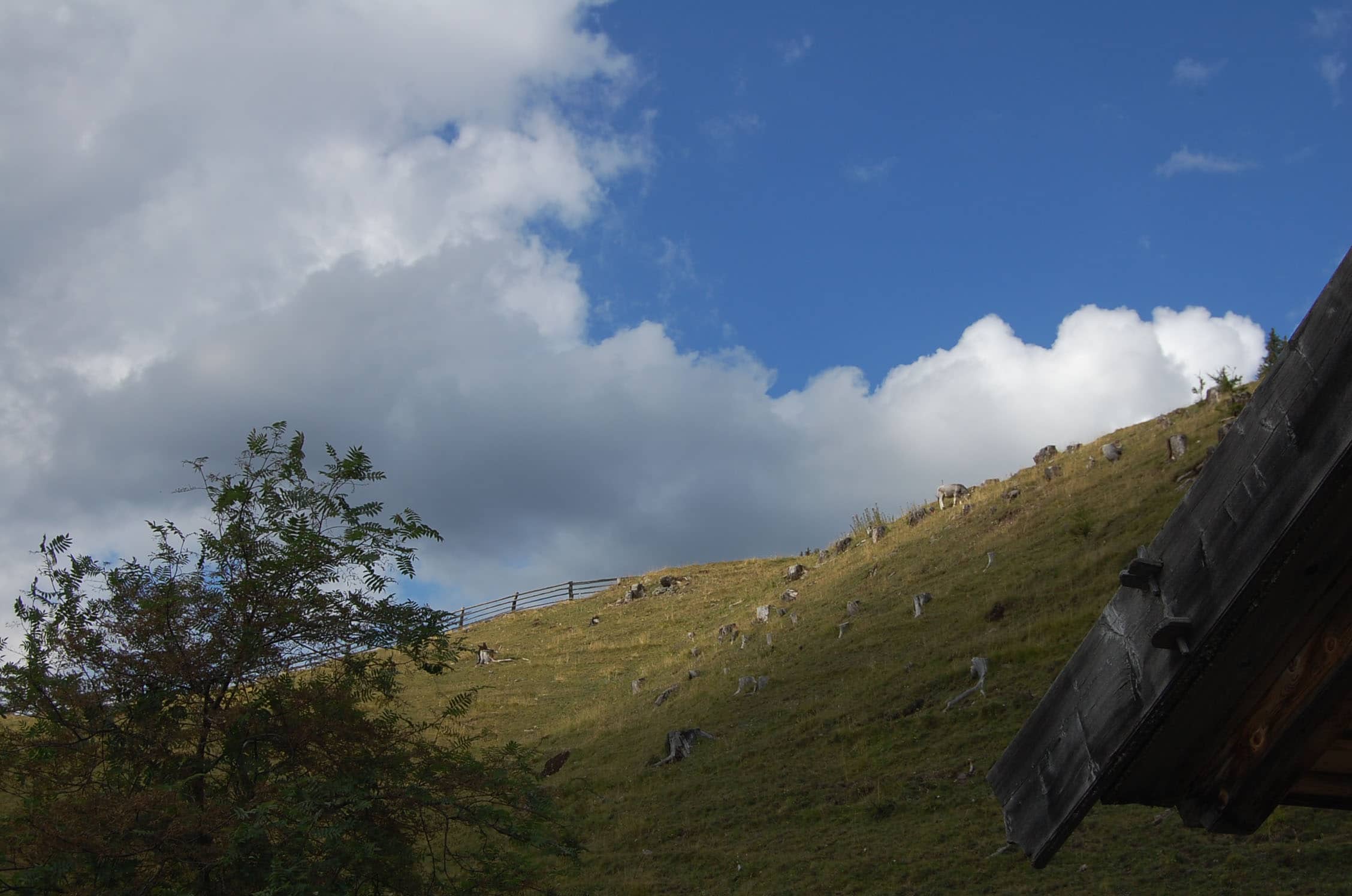Wir verschieben die Jause auf einen Berggasthof der im unteren Teil der Tour liegt. Der Abstieg geht mühelos über die Südflanke, weiter unten rasten wir in einem urigem Almgasthof (Tengler Alm). Neben einer Monster-Kuchenrolle und einem Cappuccino verirrt sich dann doch noch ein Sarntaler vom Kirchtag auf die Alm. In engen Lodenhosen mit einem breiten Ledergürtel („Fatsch“) und Hosenträgern („Krax“) trägt der junge Mann einen handgestrickten „Jangger“. Die Tracht wird nicht nur an Feiertagen von den Sarnern getragen und hebt sich stark von denen andere Südtiroler Trachten ab, wie mir Florian erklärt. Mir gefällt’s und außerdem bin ich Trachten von der Wiesn gewohnt. Der Tag geht mit der sinkenden Sonne langsam zu Ende und wir schlendern über ein Wildstiergehege bis zum Parkplatz zurück. Mir hats gefallen. Neben einer schönen Bergkulisse und urigen Berghütten hatte ich noch die Möglichkeit, ein wenig über die sehr traditionsbewussten Sarner zu erfahren. Und, ich habe mir vorgenommen wieder zu kommen und die bekannte Hufeisentour zu gehen, die wir vom Gipfel gut erkennen konnten. Wer die Tour nachlaufen möchte, hier die Tourdaten.