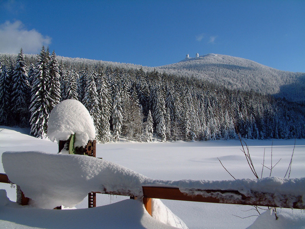 Der tief verschneite Bahnhof von Bayrisch Eisenstein – im Hintergrund der Große Arber (c) Tourismusverband Bayrische Wald